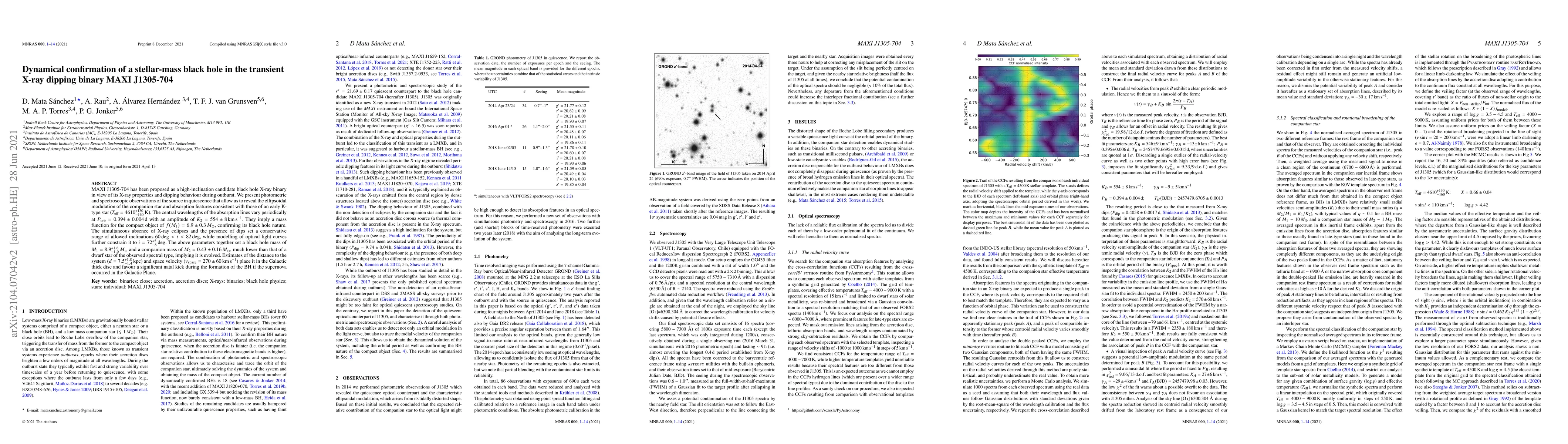 MAXI J1305-704 has been proposed as a high-inclination candidate black hole X-ray binary in view of its X-ray properties and dipping behaviour during outburst. We present photometric and spectroscopic observations of the source in quiescence that allow us to reveal the ellipsoidal modulation of the companion star and absorption features consistent with those of an early K-type star (Teff = 4610 +130 -160 K). The central wavelengths of the absorption lines vary periodically at Porb = 0.394 +- 0.004 d with an amplitude of K2 = 554 +- 8 km/s . They imply a mass function for the compact object of f(M1) = 6.9 +- 0.3 Msun, confirming its black hole nature. The simultaneous absence of X-ray eclipses and the presence of dips set a conservative range of allowed inclinations 60 deg < i < 82 deg, while modelling of optical light curves further constrain it to i = 72 +5 -8 deg. The above parameters together set a black hole mass of M1 = 8.9 +1.6 -1.0 Msun and a companion mass of M2=0.43 +- 0.16 Msun, much lower than that of a dwarf star of the observed spectral type, implying it is evolved. Estimates of the distance to the system (d = 7.5 +1.8 -1.4 kpc) and space velocity (vspace = 270 +- 60 km/s ) place it in the Galactic thick disc and favour a significant natal kick during the formation of the BH if the supernova occurred in the Galactic Plane.
