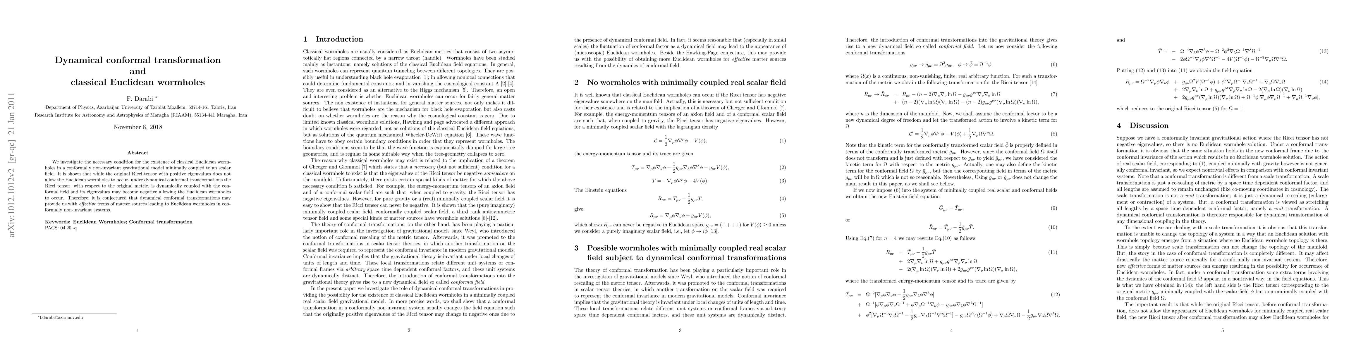 The paper explores the condition for classical Euclidean wormholes in a gravitational model with a minimally coupled scalar field. It concludes that dynamical conformal transformations can transform the Ricci tensor's eigenvalues, enabling the existence of Euclidean wormholes in systems where conformal invariance is not preserved.