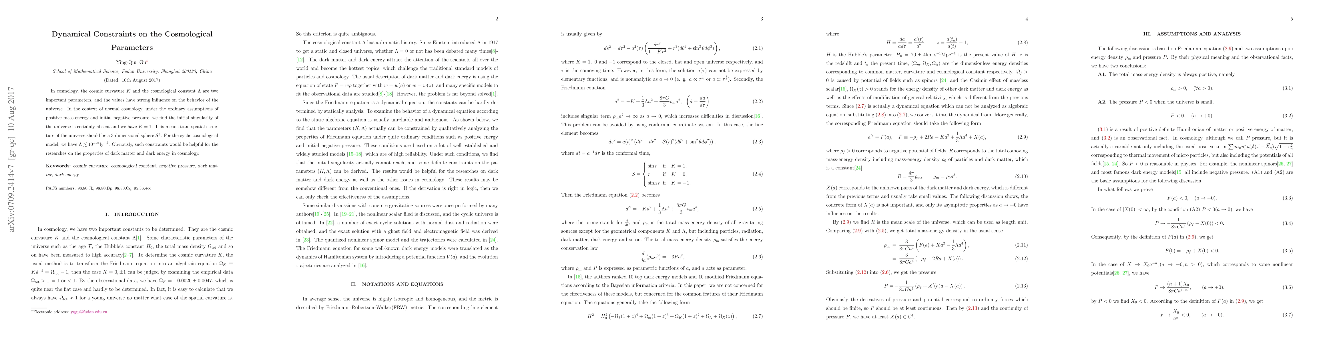 This paper explores dynamical constraints on the cosmic curvature $K$ and the cosmological constant $\Lambda$ in cosmology, finding $K=1$ and $\Lambda\lesssim 10^{-24} {\rm ly}^{-2}$ under specific assumptions, which could aid in understanding dark matter and dark energy.