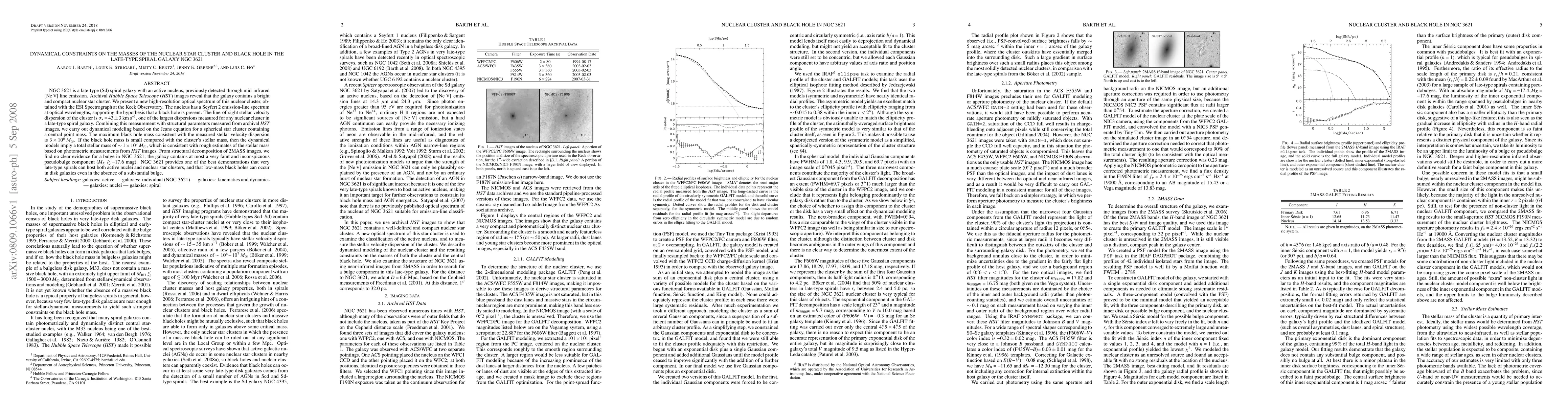 This study uses high-resolution optical spectroscopy and archival HST images to determine the masses of the nuclear star cluster and central black hole in NGC 3621, a late-type spiral galaxy. The analysis suggests a black hole mass of 3*10^6 solar masses and a total stellar mass of ~1*10^7 solar masses, highlighting the galaxy's active nucleus and lack of a substantial bulge.