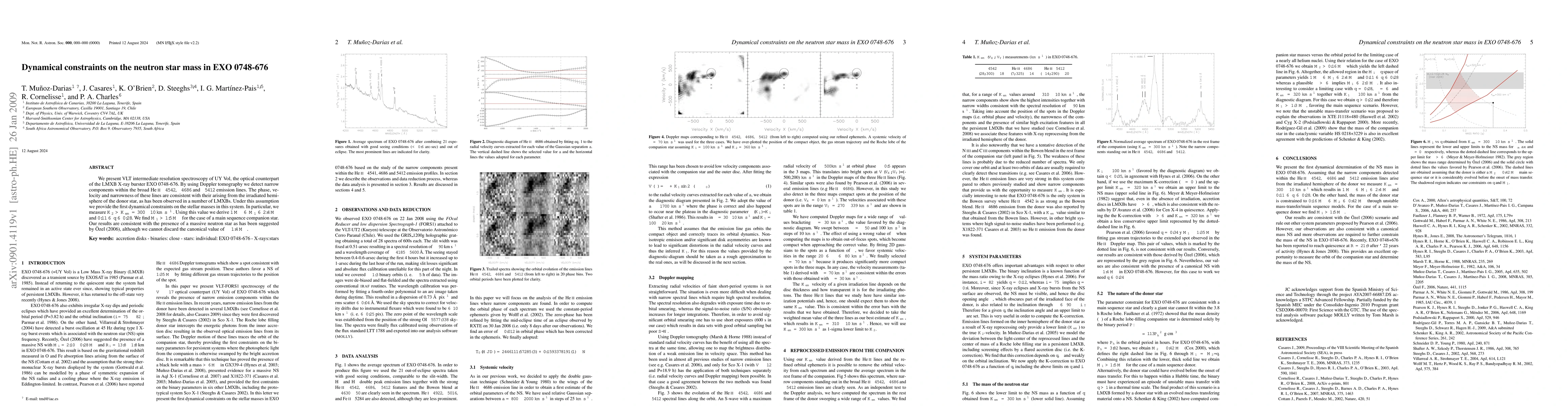 We present VLT intermediate resolution spectroscopy of UY Vol, the optical counterpart of the LMXB X-ray burster EXO 0748-676. By using Doppler tomography we detect narrow components within the broad He II 4542 A, 4686 A and 5412 A emission lines. The phase, velocity and narrowness of these lines are consistent with their arising from the irradiated hemisphere of the donor star, as has been observed in a number of LMXBs. Under this assumption we provide the first dynamical constraints on the stellar masses in this system. In particular, we measure K_2>K_em = 300 +/- 10 km/s. Using this value we derive 1 M_sun < M_1 < 2.4 M_sun and 0.11 < q < 0.28. We find M_1 > 1.5 M_sun for the case of a main sequence companion star. Our results are consistent with the presence of a massive neutron star as has been suggested by Ozel (2006), although we cannot discard the canonical value of ~1.4 M_sun.
