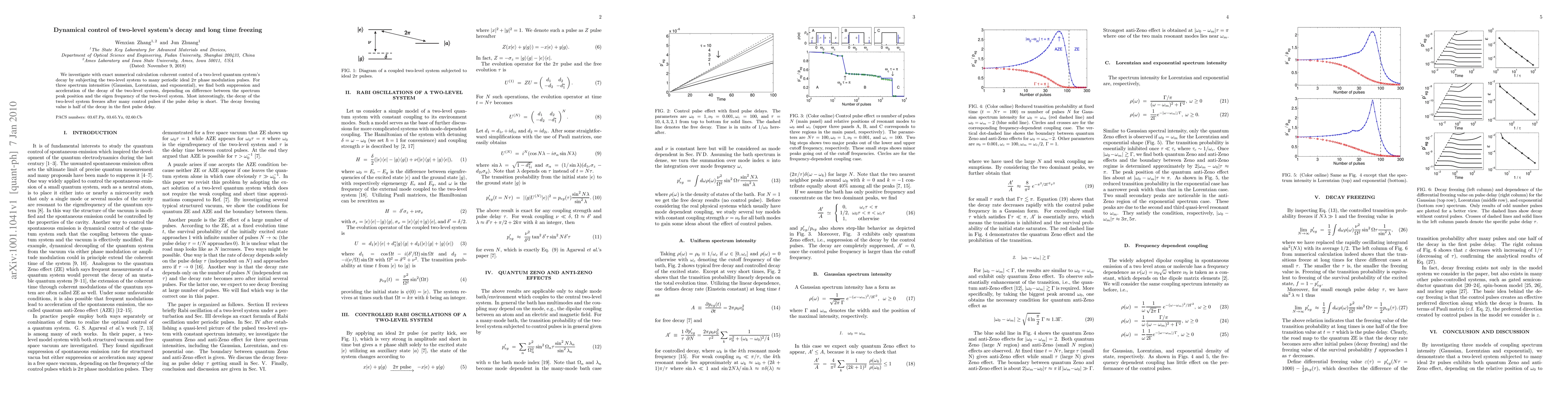 We investigate with exact numerical calculation coherent control of a two-level quantum system's decay by subjecting the two-level system to many periodic ideal $2\pi$ phase modulation pulses. For three spectrum intensities (Gaussian, Lorentzian, and exponential), we find both suppression and acceleration of the decay of the two-level system, depending on difference between the spectrum peak position and the eigen frequency of the two-level system. Most interestingly, the decay of the two-level system freezes after many control pulses if the pulse delay is short. The decay freezing value is half of the decay in the first pulse delay.