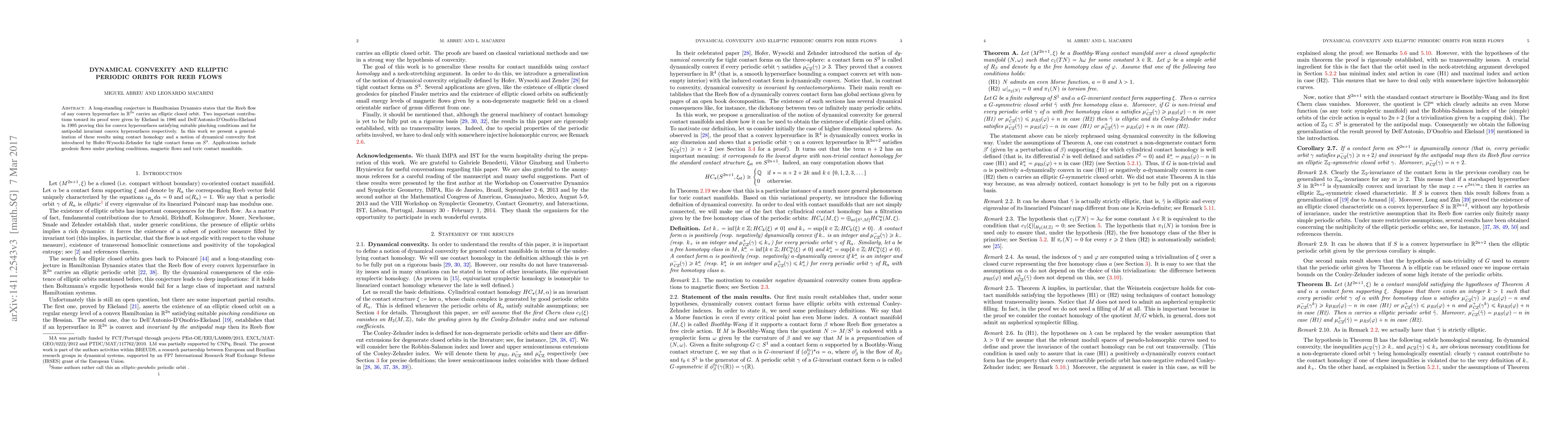 A long-standing conjecture in Hamiltonian Dynamics states that the Reeb flow of any convex hypersurface in $\mathbb{R}^{2n}$ carries an elliptic closed orbit. Two important contributions toward its proof were given by Ekeland in 1986 and Dell'Antonio-D'Onofrio-Ekeland in 1995 proving this for convex hypersurfaces satisfying suitable pinching conditions and for antipodal invariant convex hypersurfaces respectively. In this work we present a generalization of these results using contact homology and a notion of dynamical convexity first introduced by Hofer-Wysocki-Zehnder for tight contact forms on $S^3$. Applications include geodesic flows under pinching conditions, magnetic flows and toric contact manifolds.