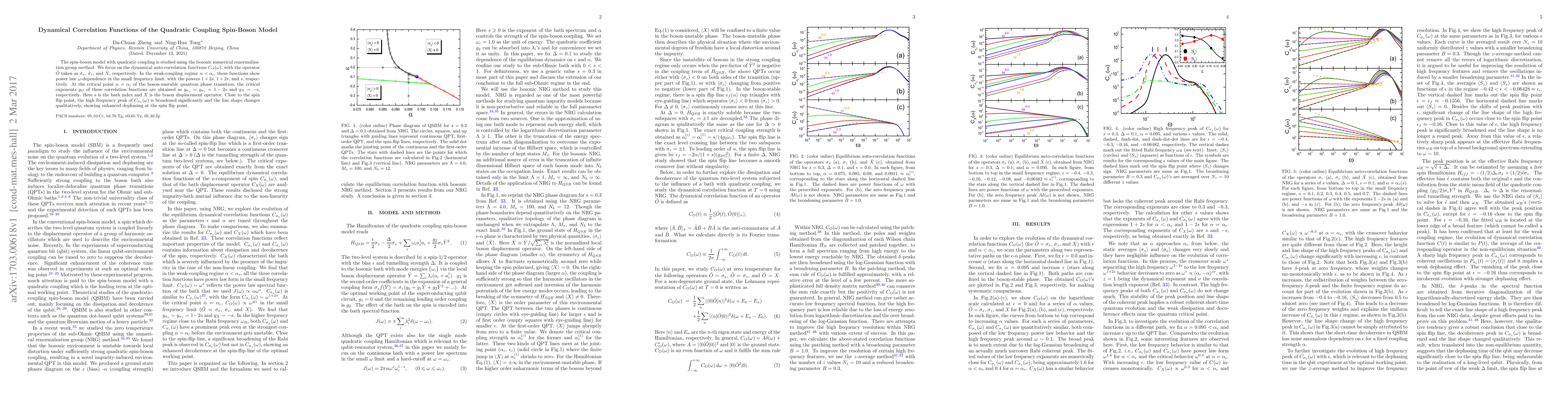 This paper investigates the dynamical auto-correlation functions in the quadratic coupling spin-boson model using the bosonic numerical renormalization group method. It finds power law $\omega$-dependences in the weak-coupling regime and critical exponents at the critical point, with significant broadening and qualitative changes in the high-frequency peak near the spin flip point.