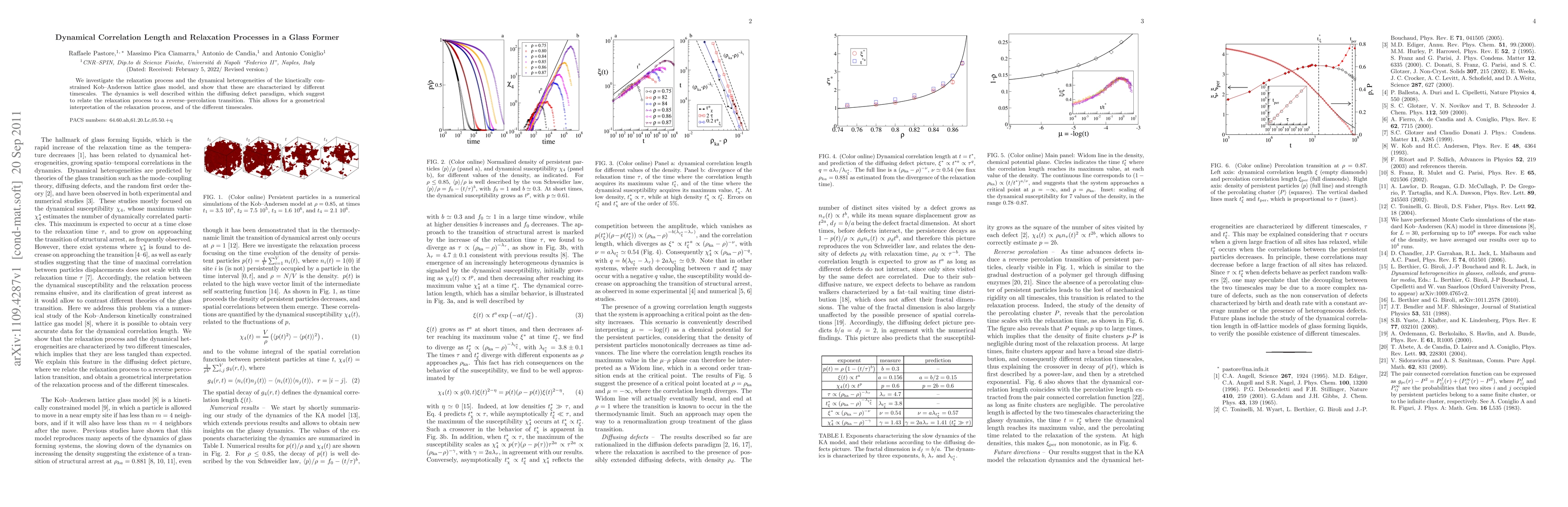 We investigate the relaxation process and the dynamical heterogeneities of the kinetically constrained Kob--Anderson lattice glass model, and show that these are characterized by different timescales. The dynamics is well described within the diffusing defect paradigm, which suggest to relate the relaxation process to a reverse--percolation transition. This allows for a geometrical interpretation of the relaxation process, and of the different timescales.