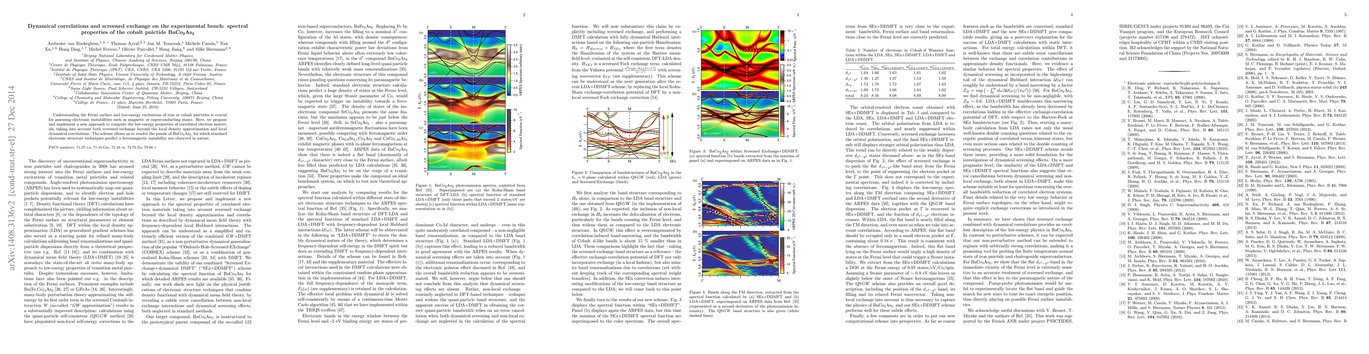 Understanding the Fermi surface and low-energy excitations of iron or cobalt pnictides is crucial for assessing electronic instabilities such as magnetic or superconducting states. Here, we propose and implement a new approach to compute the low-energy properties of correlated electron materials, taking into account both screened exchange beyond the local density approximation and local dynamical correlations. The scheme allows us to resolve the puzzle of BaCo2As2, for which standard electronic structure techniques predict a ferromagnetic instability not observed in nature.