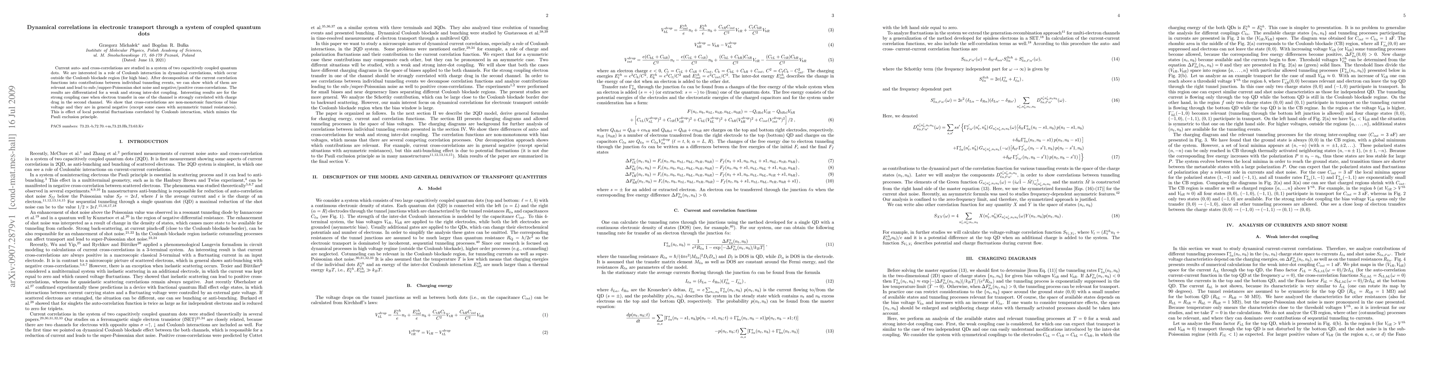 Current auto- and cross-correlations are studied in a system of two capacitively coupled quantum dots. We are interested in a role of Coulomb interaction in dynamical correlations, which occur outside the Coulomb blockade region (for high bias). After decomposition of the current correlation functions into contributions between individual tunneling events, we can show which of them are relevant and lead to sub-/supper-Poissonian shot noise and negative/positive cross-correlations. The results are differentiated for a weak and strong inter-dot coupling. Interesting results are for the strong coupling case when electron transfer in one of the channel is strongly correlated with charge drag in the second channel. We show that cross-correlations are non-monotonic functions of bias voltage and they are in general negative (except some cases with asymmetric tunnel resistances). This is effect of local potential fluctuations correlated by Coulomb interaction, which mimics the Pauli exclusion principle.