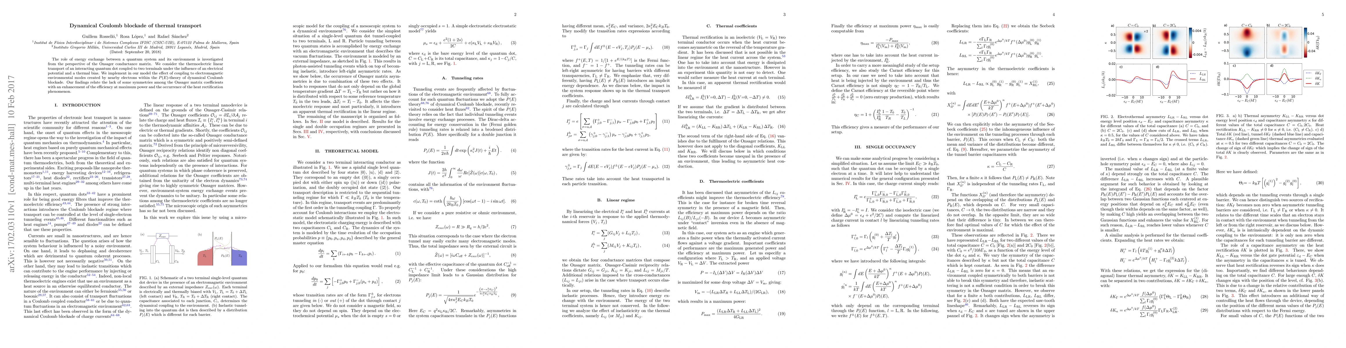 This research investigates the impact of energy exchange between a quantum dot and its environment on thermal transport, using the Onsager conductance matrix. The study models an interacting quantum dot coupled to two terminals under electrical and thermal bias, incorporating dynamical Coulomb blockade effects. Key findings include the relationship between missing symmetries in the Onsager matrix and improved efficiency at maximum power, along with the occurrence of heat rectification.
