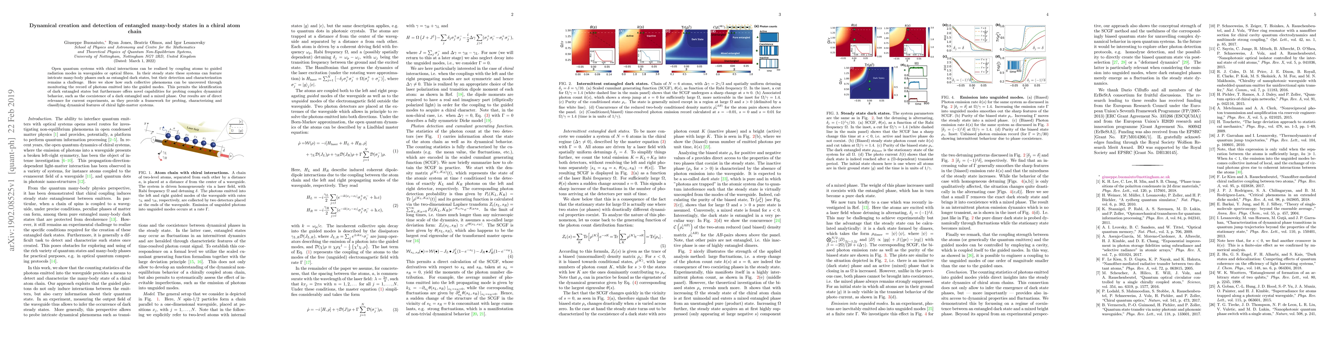 Open quantum systems with chiral interactions can be realized by coupling atoms to guided radiation modes in waveguides or optical fibres. In their steady state these systems can feature intricate many-body phases such as entangled dark states, but their detection and characterization remains a challenge. Here we show how such collective phenomena can be uncovered through monitoring the record of photons emitted into the guided modes. This permits the identification of dark entangled states but furthermore offers novel capabilities for probing complex dynamical behavior, such as the coexistence of a dark entangled and a mixed phase. Our results are of direct relevance for current experiments, as they provide a framework for probing, characterizing and classifying dynamical features of chiral light-matter systems.