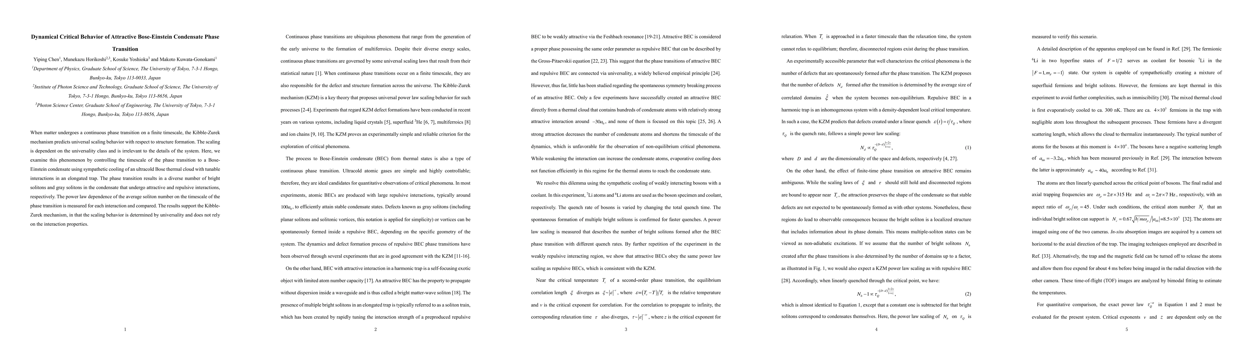 This paper investigates the dynamical critical behavior during a phase transition in an attractive Bose-Einstein condensate, confirming the Kibble-Zurek mechanism's universal scaling behavior through the formation of solitons. The study uses sympathetic cooling to control the transition timescale, revealing that the average soliton number's power law dependence is governed by universality rather than specific interaction details.