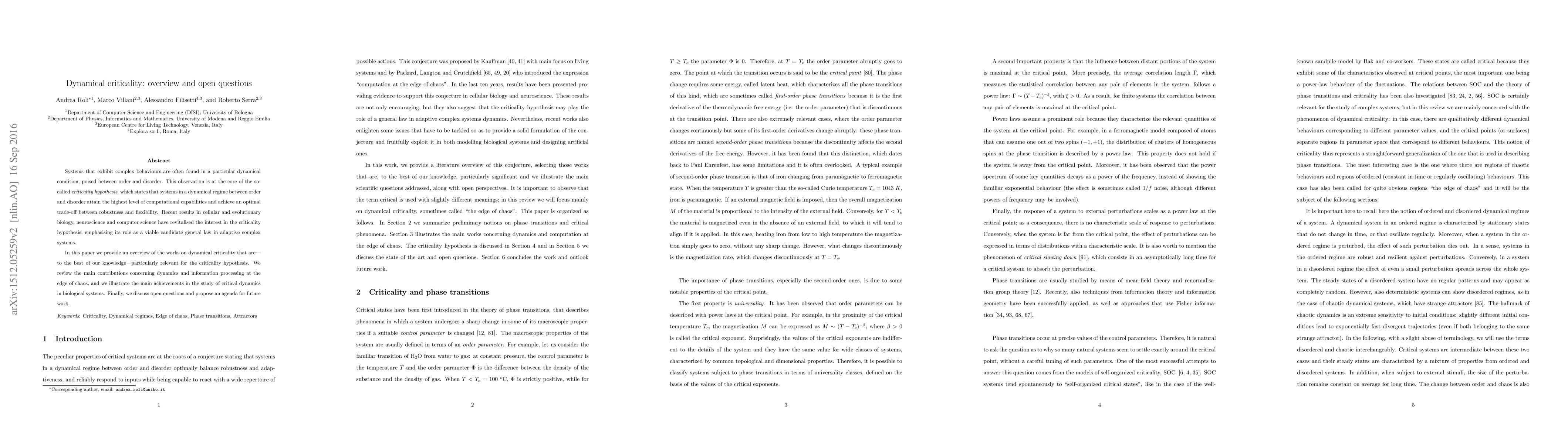 Systems that exhibit complex behaviours are often found in a particular dynamical condition, poised between order and disorder. This observation is at the core of the so-called criticality hypothesis, which states that systems in a dynamical regime between order and disorder attain the highest level of computational capabilities and achieve an optimal trade-off between robustness and flexibility. Recent results in cellular and evolutionary biology, neuroscience and computer science have revitalised the interest in the criticality hypothesis, emphasising its role as a viable candidate general law in adaptive complex systems. In this paper we provide an overview of the works on dynamical criticality that are -to the best of our knowledge- particularly relevant for the criticality hypothesis. We review the main contributions concerning dynamics and information processing at the edge of chaos, and we illustrate the main achievements in the study of critical dynamics in biological systems. Finally, we discuss open questions and propose an agenda for future work.