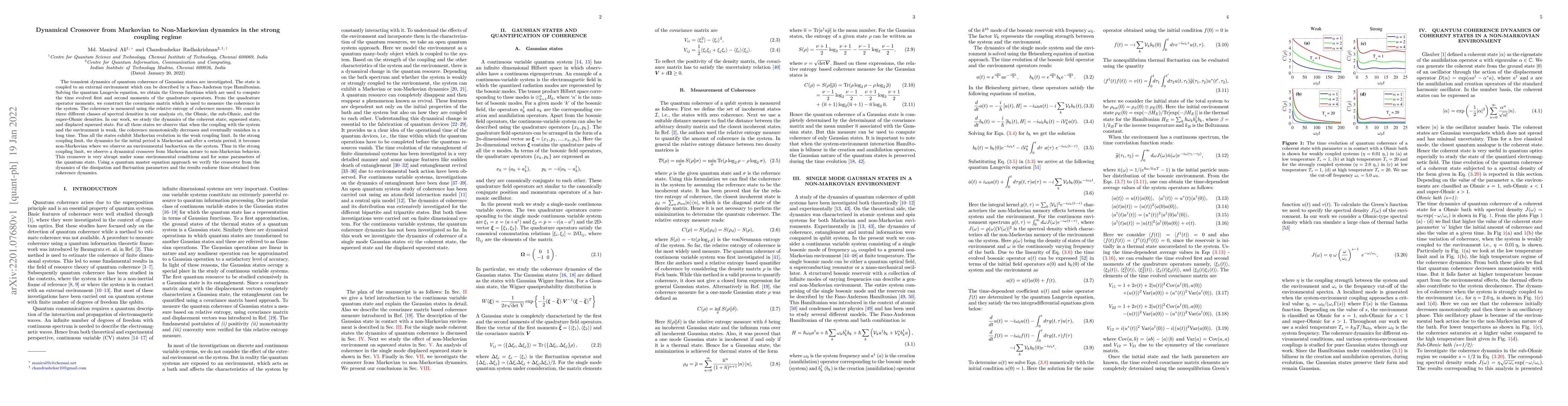 This paper investigates the dynamical crossover from Markovian to non-Markovian dynamics in quantum coherence of Gaussian states under strong coupling conditions. It finds that in the strong coupling regime, the system initially exhibits Markovian evolution before transitioning to non-Markovian behavior due to environmental backaction.