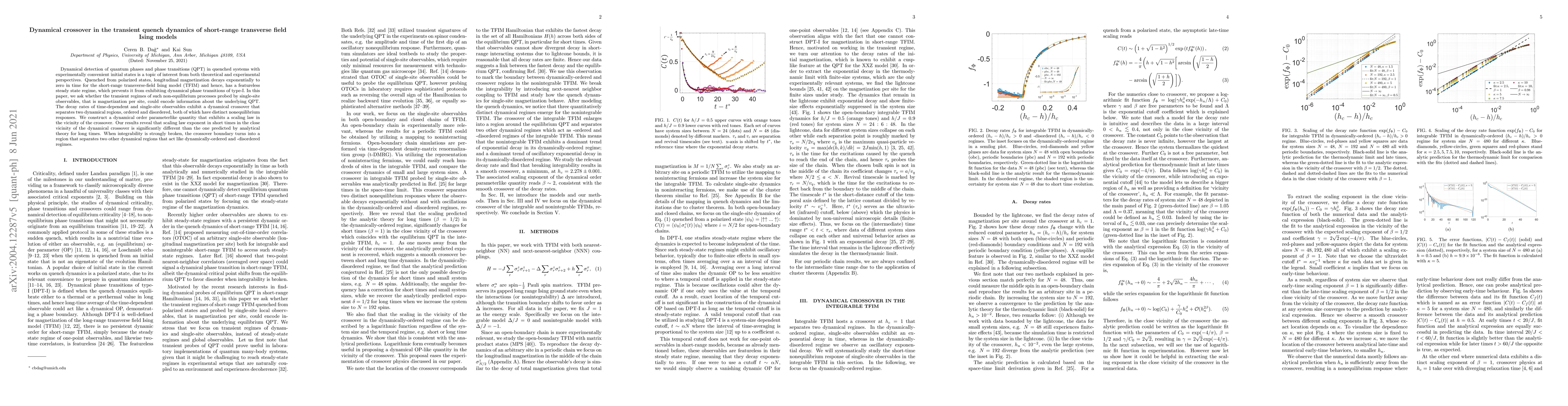 This paper investigates the transient quench dynamics of short-range transverse field Ising models, revealing a dynamical crossover between ordered and disordered regimes. The study finds that the scaling behavior near the crossover differs significantly from long-time predictions, especially when integrability is disrupted.