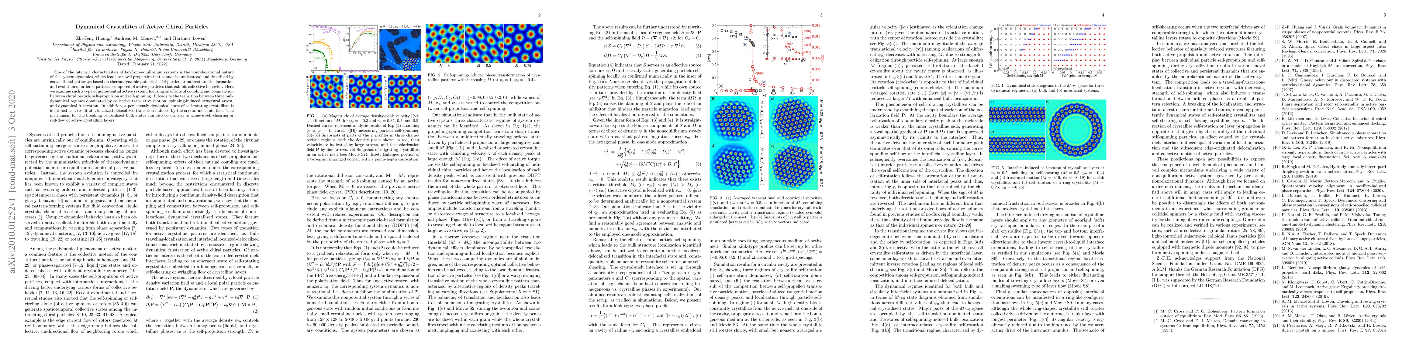 One of the intrinsic characteristics of far-from-equilibrium systems is the nonrelaxational nature of the system dynamics, which leads to novel properties that cannot be understood and described by conventional pathways based on thermodynamic potentials. Of particular interest are the formation and evolution of ordered patterns composed of active particles that exhibit collective behavior. Here we examine such a type of nonpotential active system, focusing on effects of coupling and competition between chiral particle self-propulsion and self-spinning. It leads to the transition between three bulk dynamical regimes dominated by collective translative motion, spinning-induced structural arrest, and dynamical frustration. In addition, a persistently dynamical state of self-rotating crystallites is identified as a result of a localized-delocalized transition induced by the crystal-melt interface. The mechanism for the breaking of localized bulk states can also be utilized to achieve self-shearing or self-flow of active crystalline layers.