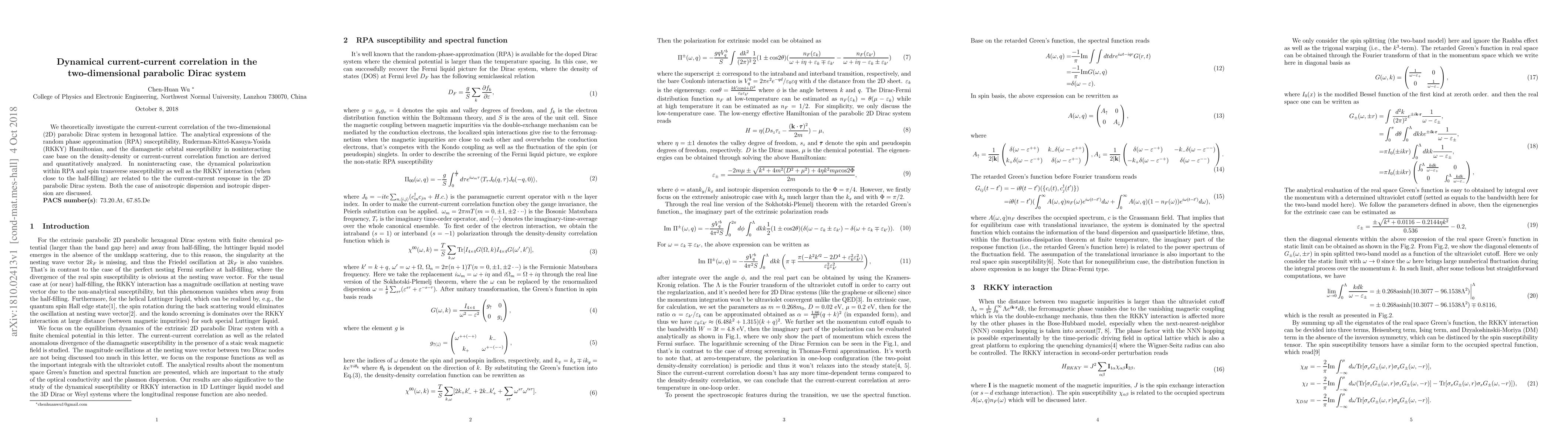 We theoretically investigate the current-current correlation of the two-dimensional (2D) parabolic Dirac system in hexogonal lattice. The analytical expressions of the random phase approximation (RPA) susceptibility, Ruderman-Kittel-Kasuya-Yosida (RKKY) Hamiltonian, and the diamagnetic orbital susceptibility in noninteracting case base on the density-density or current-current correlation function are derived and quantitatively analyzed. In noninteracting case, the dynamical polarization with- in RPA and spin transverse susceptibility as well as the RKKY interaction (when close to the half-filling) are related to the the current-current response in the 2D parabolic Dirac system. Both the case of anisotropic dispersion and isotropic dispersion are discussed.