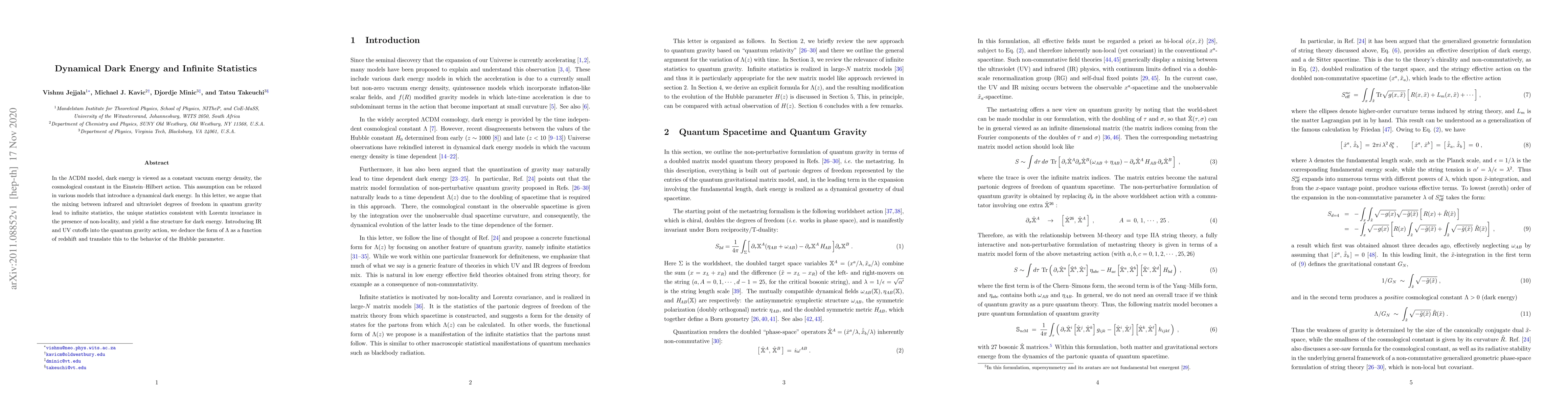 In the $\Lambda$CDM model, dark energy is viewed as a constant vacuum energy density, the cosmological constant in the Einstein--Hilbert action. This assumption can be relaxed in various models that introduce a dynamical dark energy. In this letter, we argue that the mixing between infrared and ultraviolet degrees of freedom in quantum gravity lead to infinite statistics, the unique statistics consistent with Lorentz invariance in the presence of non-locality, and yield a fine structure for dark energy. Introducing IR and UV cutoffs into the quantum gravity action, we deduce the form of $\Lambda$ as a function of redshift and translate this to the behavior of the Hubble parameter.