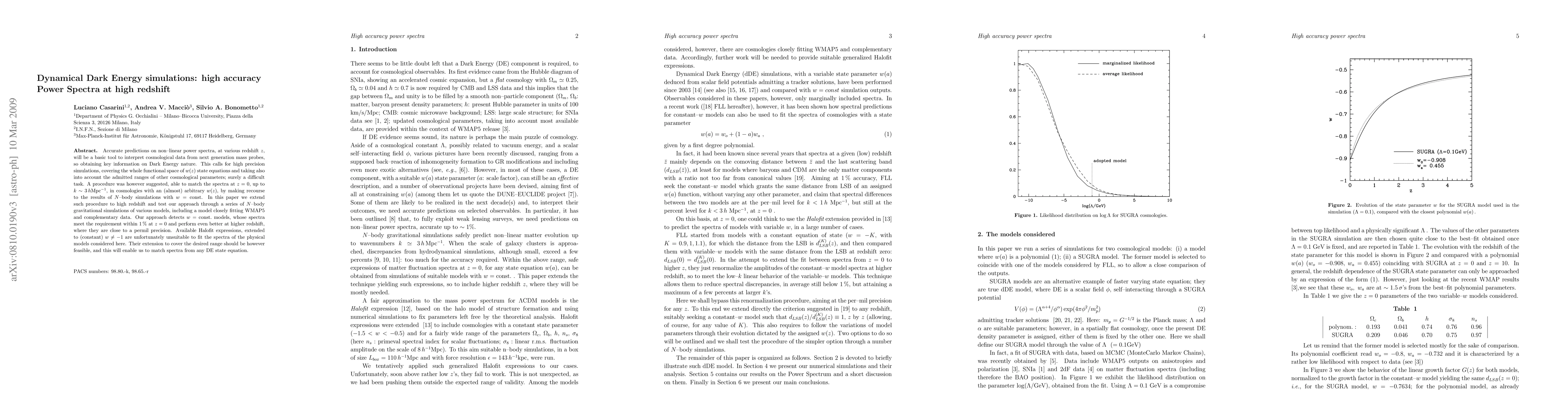 Accurate predictions on non--linear power spectra, at various redshift z, will be a basic tool to interpret cosmological data from next generation mass probes, so obtaining key information on Dark Energy nature. This calls for high precision simulations, covering the whole functional space of w(z) state equations and taking also into account the admitted ranges of other cosmological parameters; surely a difficult task. A procedure was however suggested, able to match the spectra at z=0, up to k~3, hMpc^{-1}, in cosmologies with an (almost) arbitrary w(z), by making recourse to the results of N-body simulations with w = const. In this paper we extend such procedure to high redshift and test our approach through a series of N-body gravitational simulations of various models, including a model closely fitting WMAP5 and complementary data. Our approach detects w= const. models, whose spectra meet the requirement within 1% at z=0 and perform even better at higher redshift, where they are close to a permil precision. Available Halofit expressions, extended to (constant) w \neq -1 are unfortunately unsuitable to fit the spectra of the physical models considered here. Their extension to cover the desired range should be however feasible, and this will enable us to match spectra from any DE state equation.