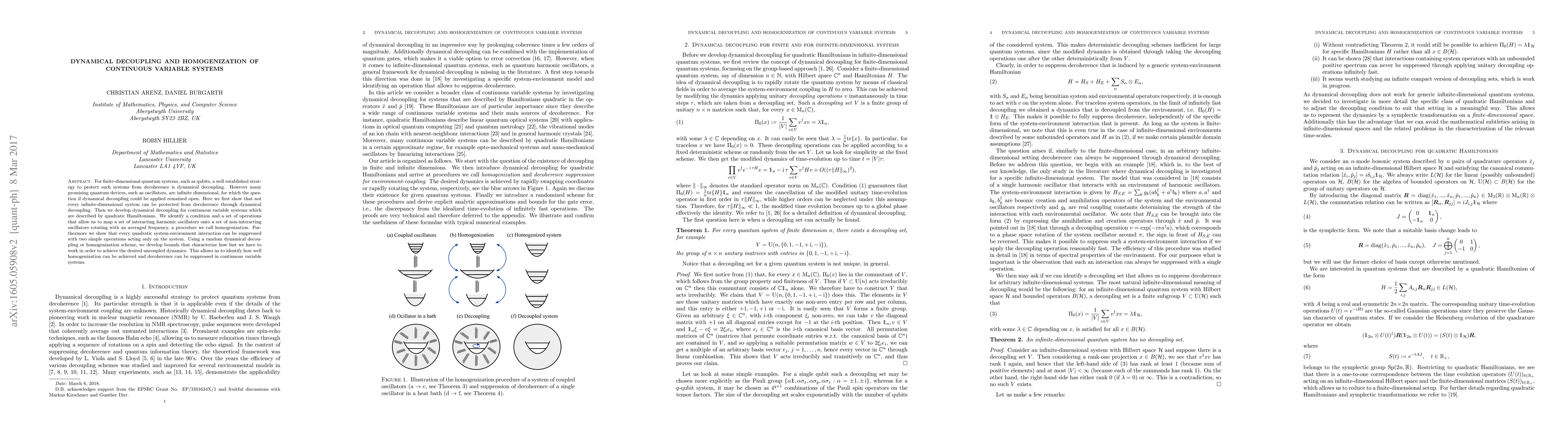 This paper explores the application of dynamical decoupling to infinite-dimensional quantum systems, specifically continuous variable systems like oscillators, and develops a method called homogenization to suppress decoherence. It establishes conditions and operations for mapping interacting oscillators to non-interacting ones, and provides bounds on the speed required to achieve effective decoupling.