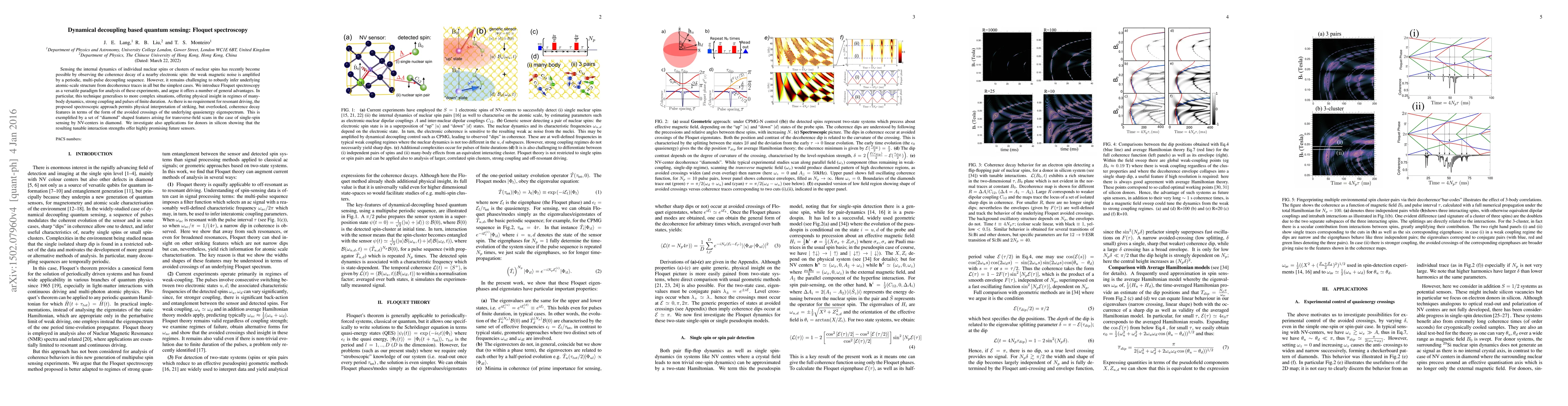 Sensing the internal dynamics of individual nuclear spins or clusters of nuclear spins has recently become possible by observing the coherence decay of a nearby electronic spin: the weak magnetic noise is amplified by a periodic, multi-pulse decoupling sequence. However, it remains challenging to robustly infer underlying atomic-scale structure from decoherence traces in all but the simplest cases. We introduce Floquet spectroscopy as a versatile paradigm for analysis of these experiments, and argue it offers a number of general advantages. In particular, this technique generalises to more complex situations, offering physical insight in regimes of many-body dynamics, strong coupling and pulses of finite duration. As there is no requirement for resonant driving, the proposed spectroscopic approach permits physical interpretation of striking, but overlooked, coherence decay features in terms of the form of the avoided crossings of the underlying quasienergy eigenspectrum. This is exemplified by a set of "diamond" shaped features arising for transverse-field scans in the case of single-spin sensing by NV-centers in diamond. We investigate also applications for donors in silicon showing that the resulting tunable interaction strengths offer highly promising future sensors.