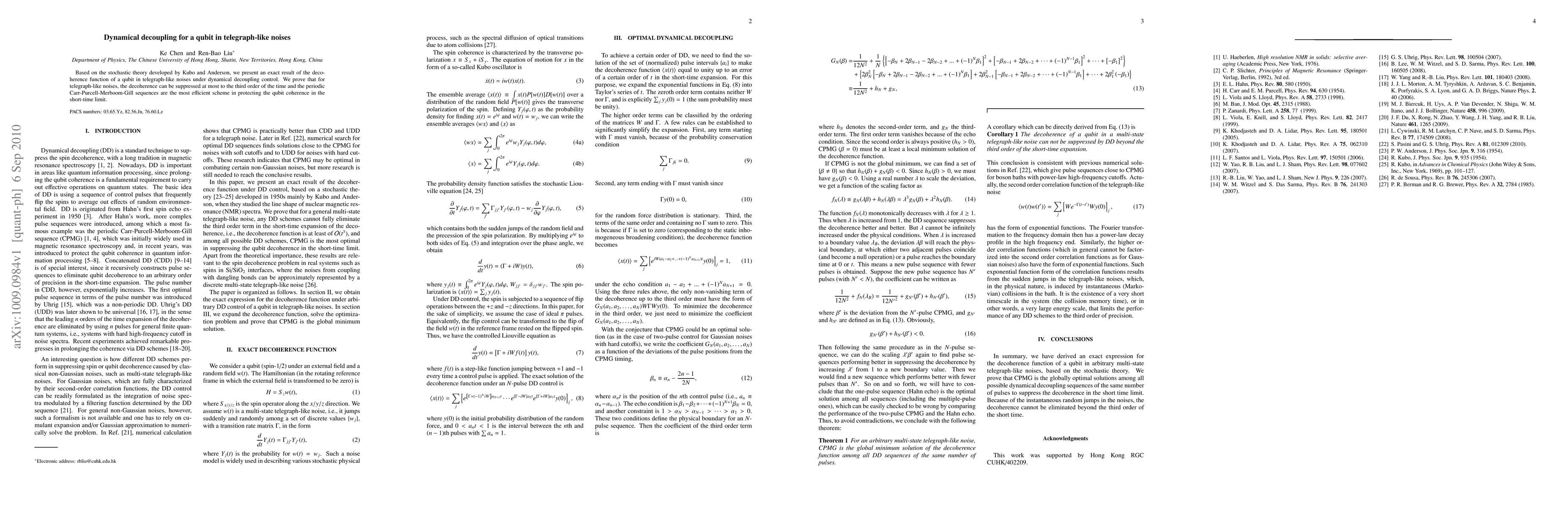 This paper presents an exact decoherence function for a qubit subjected to telegraph-like noise, demonstrating that dynamical decoupling can suppress decoherence to the third order in time. The study finds that periodic Carr-Purcell-Merboom-Gill sequences are the most effective method for maintaining qubit coherence in the short-time limit.