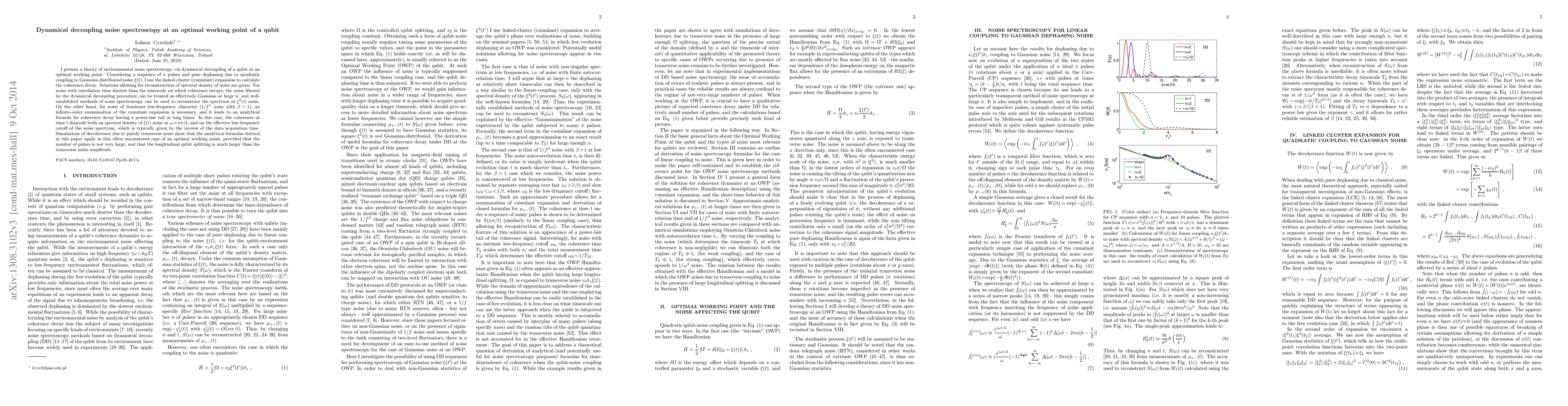 This paper presents a theoretical framework for environmental noise spectroscopy using dynamical decoupling at an optimal qubit working point. The study employs a linked-cluster expansion to calculate coherence decay under Gaussian noise, providing analytical solutions for reconstructing the noise spectral density.
