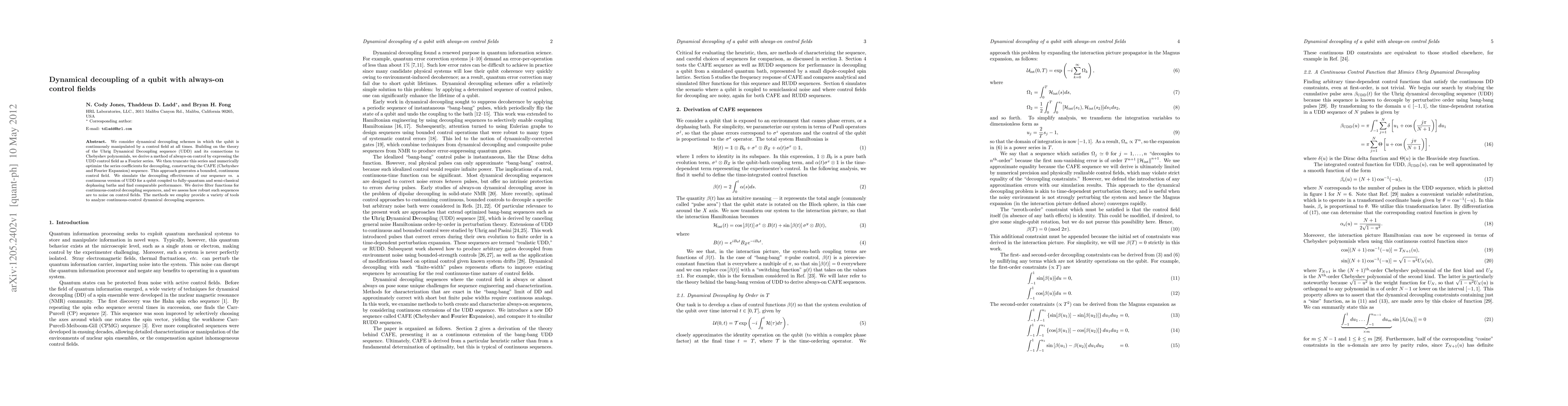 This research develops a continuous control field method for dynamical decoupling of qubits using a Fourier series expansion of the Uhrig Dynamical Decoupling sequence, termed the CAFE sequence. The study finds comparable decoupling performance to a continuous version of UDD and assesses the robustness of these sequences against control field noise.
