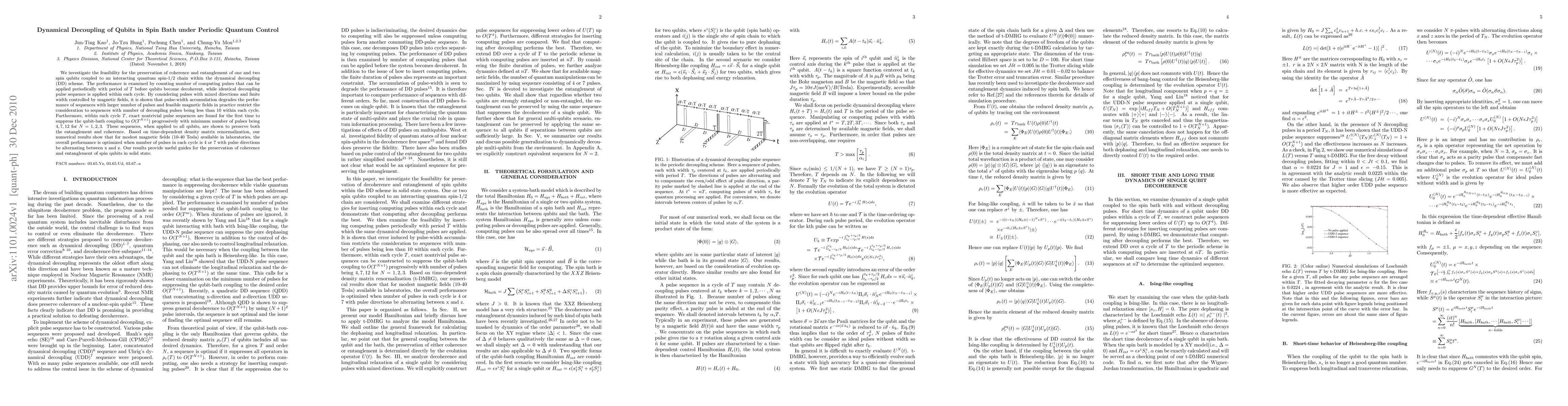 This paper explores the dynamical decoupling of qubits in a spin bath using periodic quantum control to preserve coherence and entanglement. It finds optimal pulse sequences that suppress qubit-bath coupling effectively, showing that sequences with 4 or 7 pulses optimize performance for practical magnetic fields, preserving both coherence and entanglement.