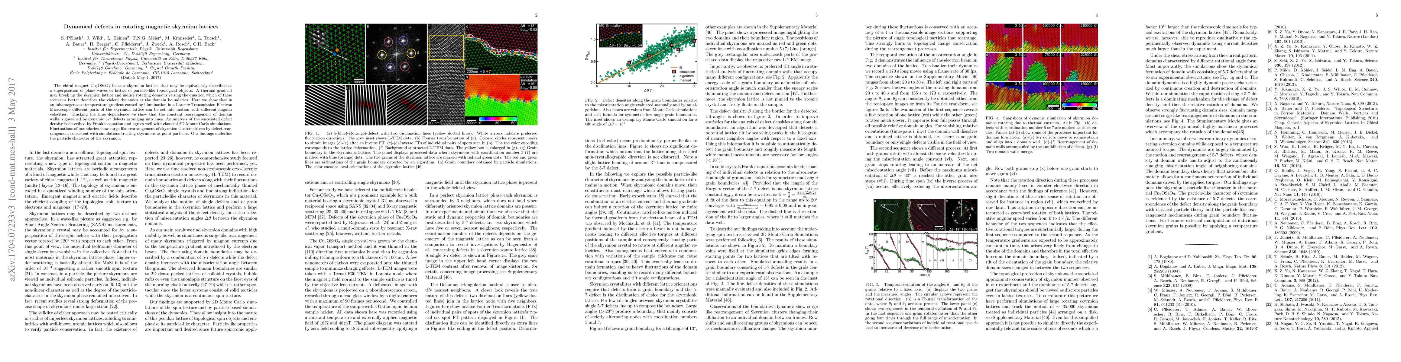 The chiral magnet Cu$_{2}$OSeO$_{3}$ hosts a skyrmion lattice, that may be equivalently described as a superposition of plane waves or lattice of particle-like topological objects. A thermal gradient may break up the skyrmion lattice and induce rotating domains raising the question which of these scenarios better describes the violent dynamics at the domain boundaries. Here we show that in an inhomogeneous temperature gradient caused by illumination in a Lorentz Transmission Electron Microscope different parts of the skyrmion lattice can be set into motion with different angular velocities. Tracking the time dependence we show that the constant rearrangement of domain walls is governed by dynamic 5-7 defects arranging into lines. An analysis of the associated defect density is described by Frank's equation and agrees well with classical 2D-Monte Carlo simulations. Fluctuations of boundaries show surge-like rearrangement of skyrmion clusters driven by defect rearrangement consistent with simulations treating skyrmions as point particles. Our findings underline the particle character of the skyrmion.