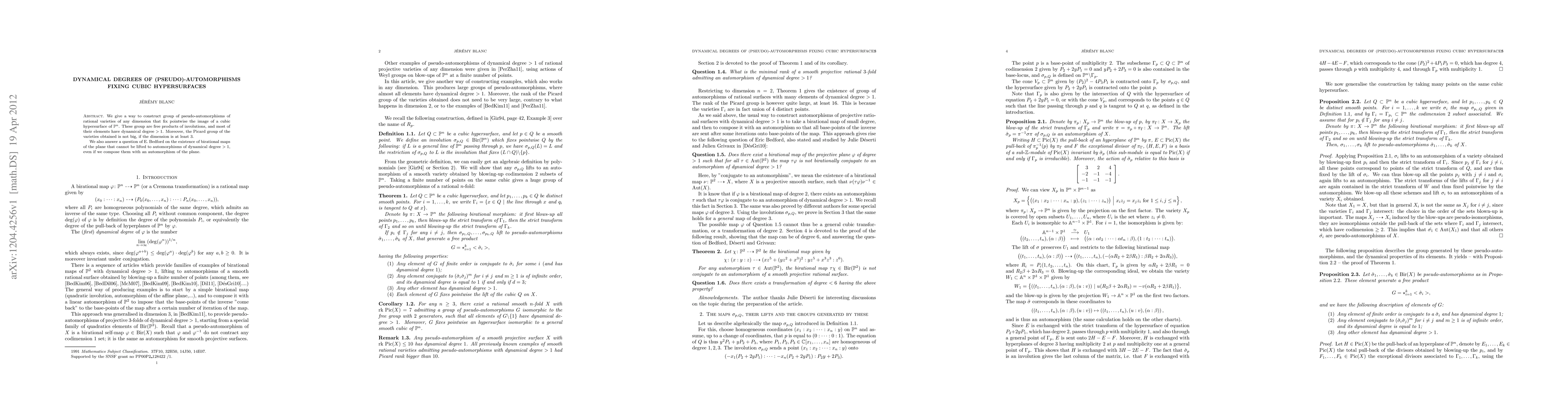 This paper constructs groups of pseudo-automorphisms fixing cubic hypersurfaces in rational varieties, showing most elements have dynamical degree greater than 1. It also resolves a question by proving the existence of birational maps of the plane that cannot be lifted to higher-degree automorphisms.
