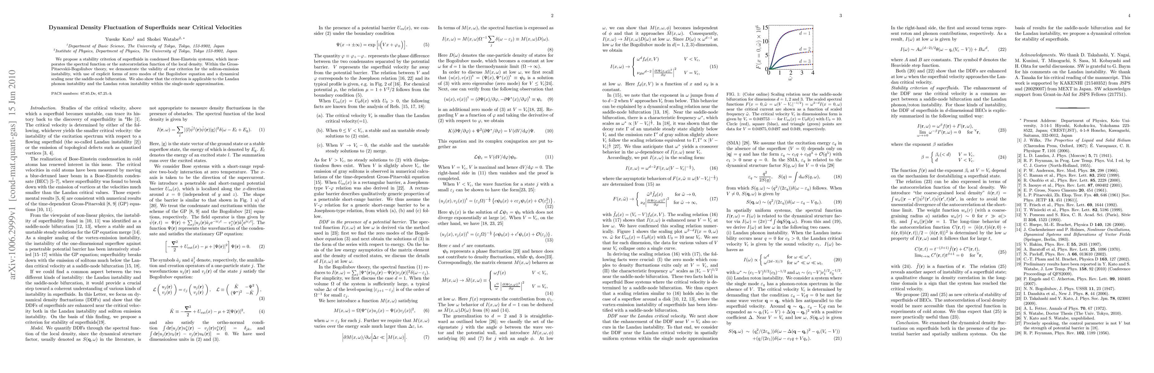 This research proposes a stability criterion for superfluids using the spectral function, validated through the Gross-Pitaevskii-Bogoliubov theory for soliton-emission instability. It also applies the criterion to Landau phonon and roton instabilities, demonstrating its broad applicability in condensed Bose-Einstein systems.