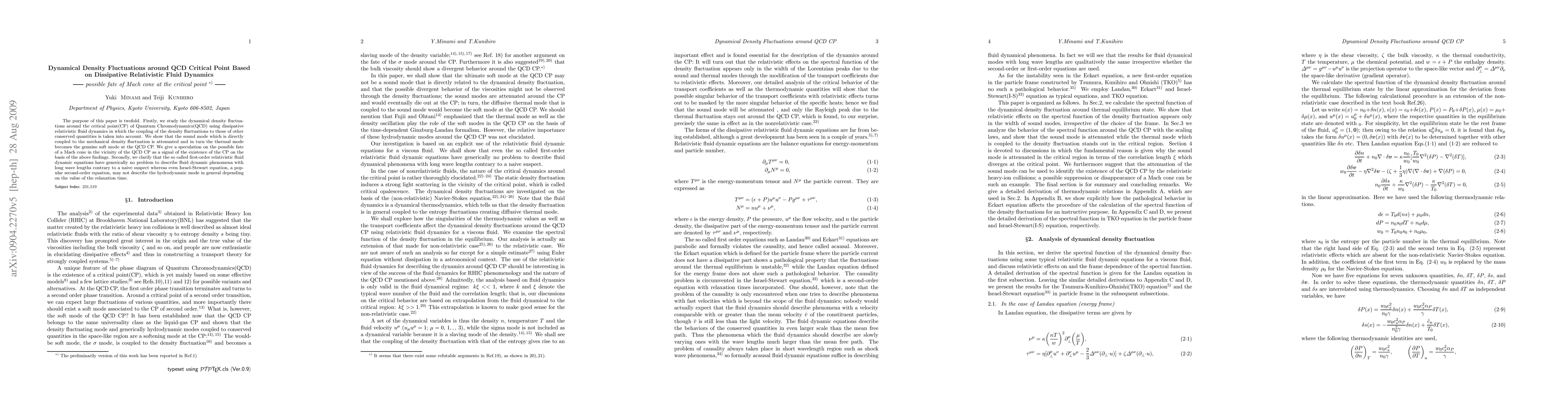The purpose of this paper is twofold. Firstly, we study the dynamical density fluctuations around the critical point(CP) of Quantum Chromodynamics(QCD) using dissipative relativistic fluid dynamics in which the coupling of the density fluctuations to those of other conserved quantities is taken into account. We show that the sound mode which is directly coupled to the mechanical density fluctuation is attenuated and in turn the thermal mode becomes the genuine soft mode at the QCD CP. We give a speculation on the possible fate of a Mach cone in the vicinity of the QCD CP as a signal of the existence of the CP on the basis of the above findings. Secondly, we clarify that the so called first-order relativistic fluid dynamic equations have generically no problem to describe fluid dynamic phenomena with long wave lengths contrary to a naive suspect whereas even Israel-Stewart equation, a popular second-order equation, may not describe the hydrodynamic mode in general depending on the value of the relaxation time.