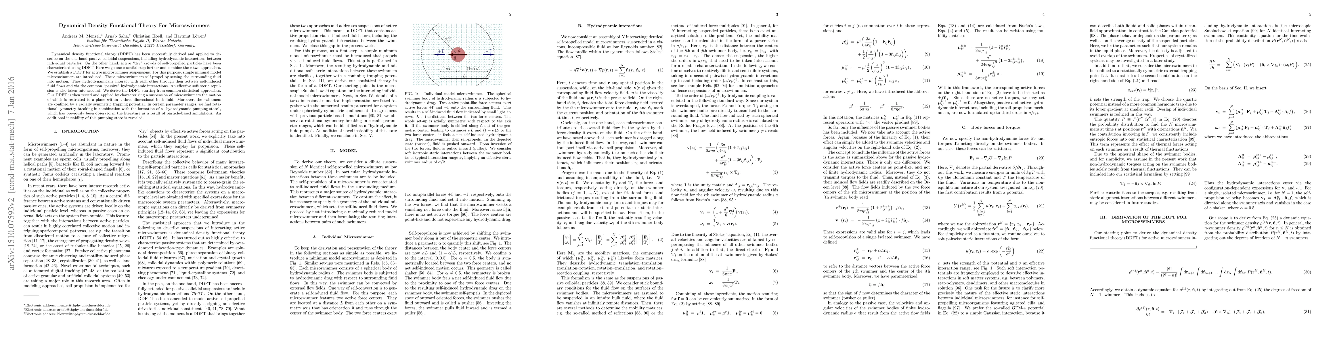This paper develops a dynamical density functional theory (DDFT) to describe active microswimmers in suspensions, combining passive colloidal dynamics with self-propelled particle interactions. The model reveals rotational symmetry breaking and a "hydrodynamic pumping state" under certain conditions, along with an additional instability in the pumping state.