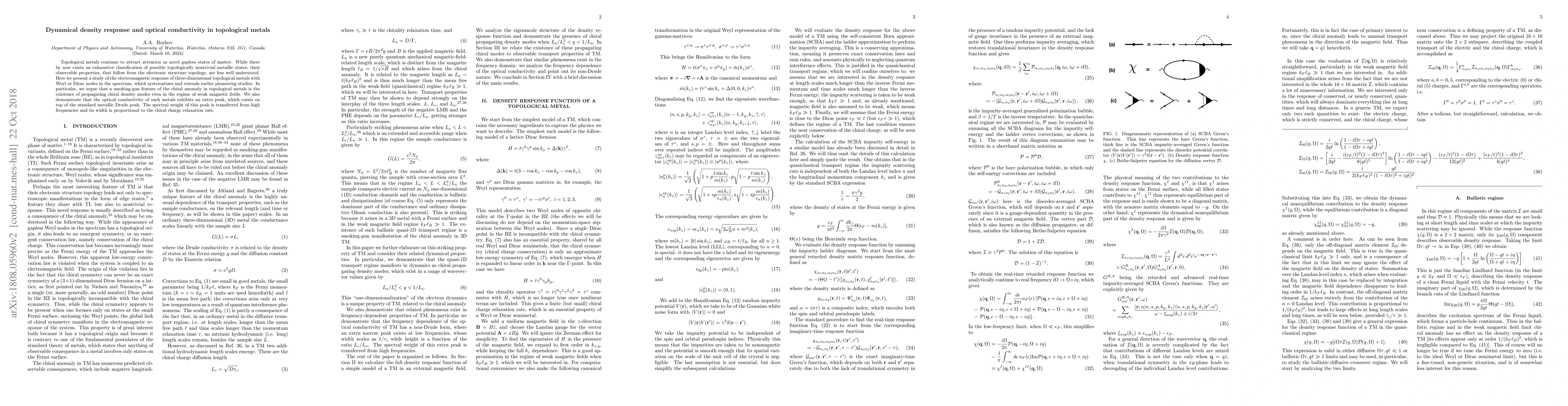 This paper investigates the dynamical density response and optical conductivity in topological metals, highlighting the chiral anomaly's signature through propagating chiral density modes and an additional peak in optical conductivity, distinct from the standard metallic Drude peak. The peak's spectral weight shifts from high frequencies and its width correlates with the chiral charge relaxation rate.