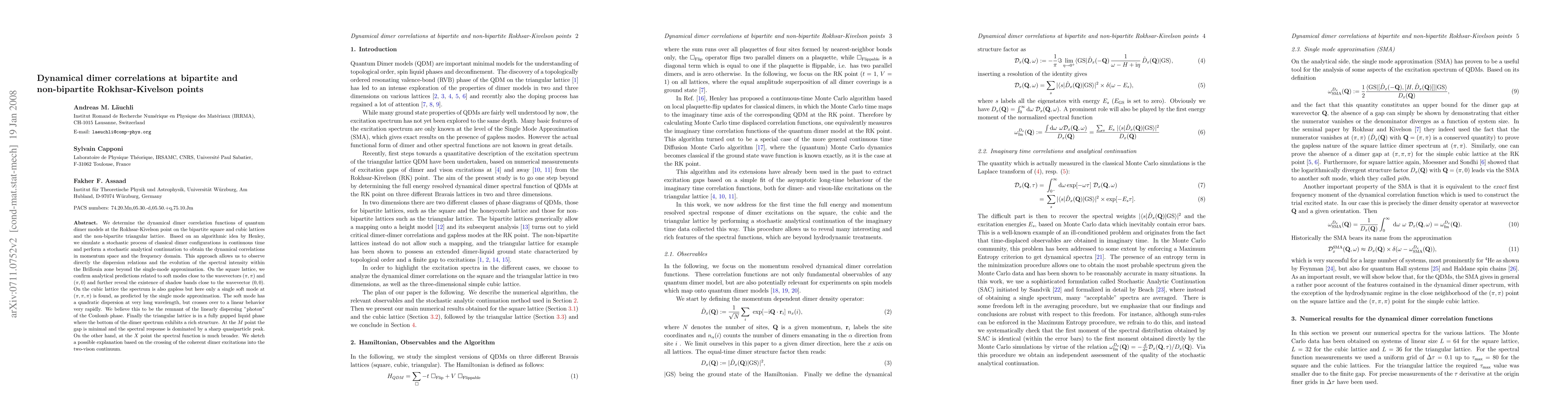 This paper investigates dynamical dimer correlation functions in quantum dimer models at Rokhsar-Kivelson points on bipartite and non-bipartite lattices using a stochastic process simulation. It reveals soft modes and shadow bands on square and cubic lattices, and a gapped liquid phase with distinct spectral responses on the triangular lattice.