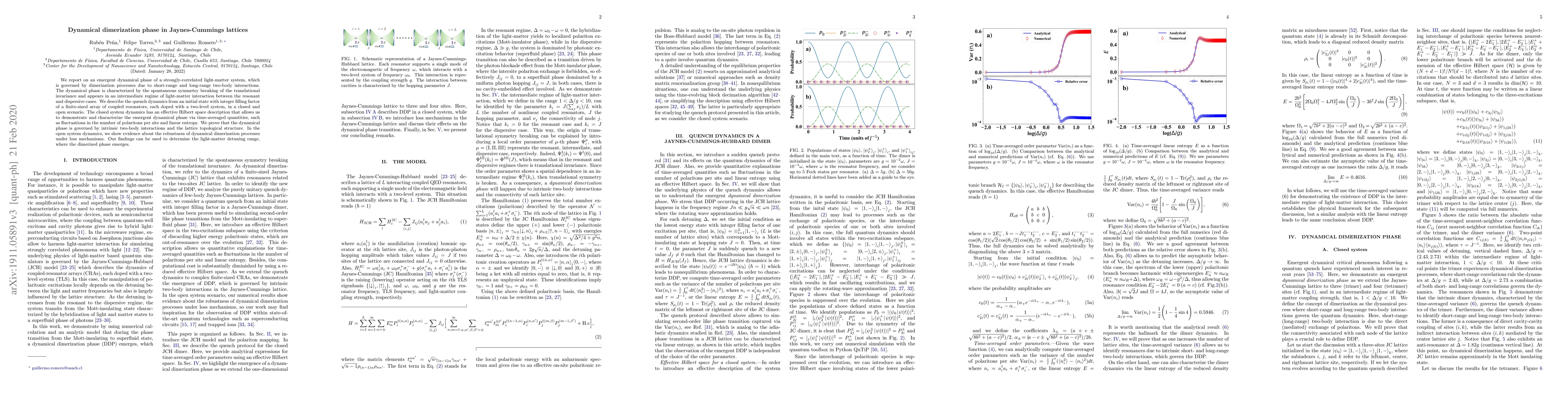 We report on an emergent dynamical phase of a strongly-correlated light-matter system, which is governed by dimerization processes due to short-range and long-range two-body interactions. The dynamical phase is characterized by the spontaneous symmetry breaking of the translational invariance and appears in an intermediate regime of light-matter interaction between the resonant and dispersive cases. We describe the quench dynamics from an initial state with integer filling factor of a finite-sized array of coupled resonators, each doped with a two-level system, in a closed and open scenario. The closed system dynamics has an effective Hilbert space description that allows us to demonstrate and characterize the emergent dynamical phase via time-averaged quantities, such as fluctuations in the number of polaritons per site and linear entropy. We prove that the dynamical phase is governed by intrinsic two-body interactions and the lattice topological structure. In the open system dynamics, we show evidence about the robustness of dynamical dimerization processes under loss mechanisms. Our findings can be used to determine the light-matter detuning range, where the dimerized phase emerges.