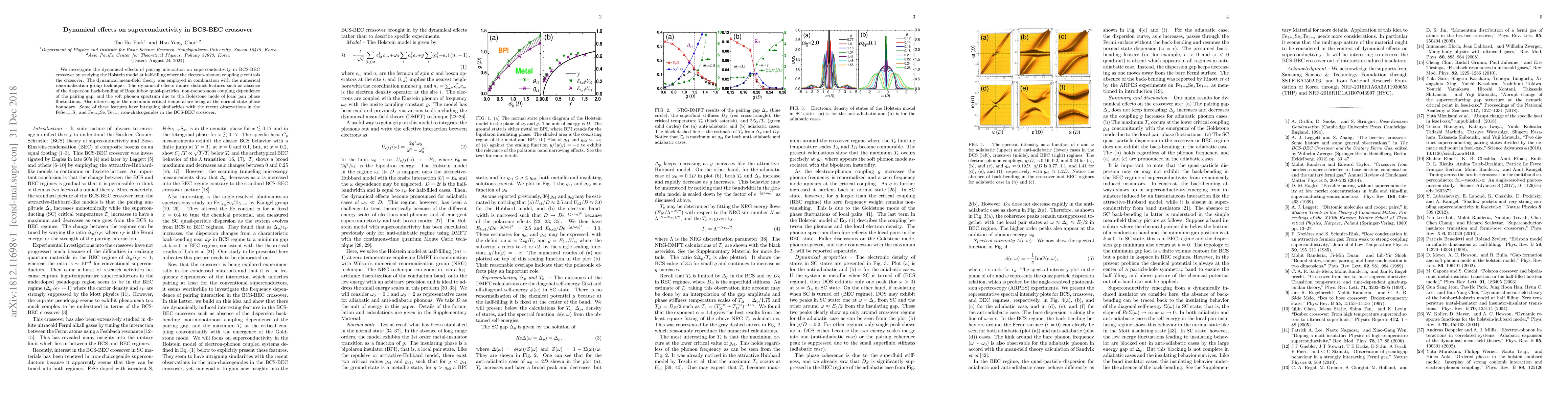 We investigate the dynamical effects of pairing interaction on superconductivity in BCS-BEC crossover by studying the Holstein model at half-filling where the electron-phonon coupling $g$ controls the crossover. The dynamical mean-field theory was employed in combination with the numerical renormalization group technique. The dynamical effects induce distinct features such as absenceof the dispersion back-bending of Bogoliubov quasi-particles, non-monotonous coupling dependence of the pairing gap, and the soft phonon spectrum due to the Goldstone mode of local pair phase fluctuations. Also interesting is the maximum critical temperature being at the normal state phase boundary. Some of these features have intriguing similarities with the recent observations in the FeSe$_{1-x}$S$_x$ and Fe$_{1+y}$Se$_x$Te$_{1-x}$ iron-chalcogenides in the BCS-BEC crossover.