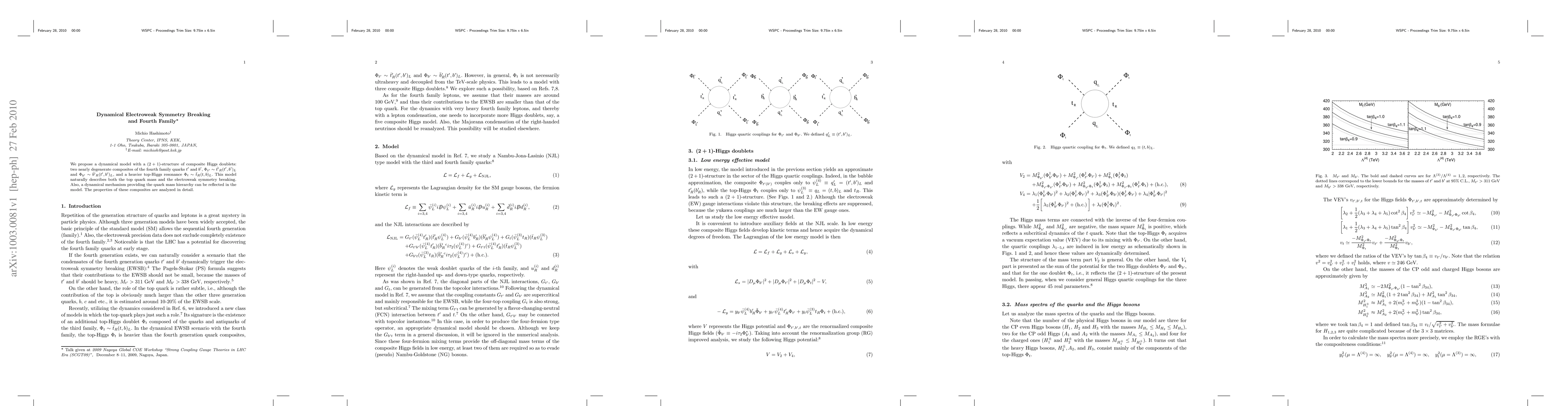 This paper proposes a dynamical model featuring composite Higgs doublets from a fourth family of quarks, explaining electroweak symmetry breaking and the top quark mass. The model includes nearly degenerate composites of t' and b' quarks and a heavier top-Higgs resonance, providing a natural mechanism for quark mass hierarchy.