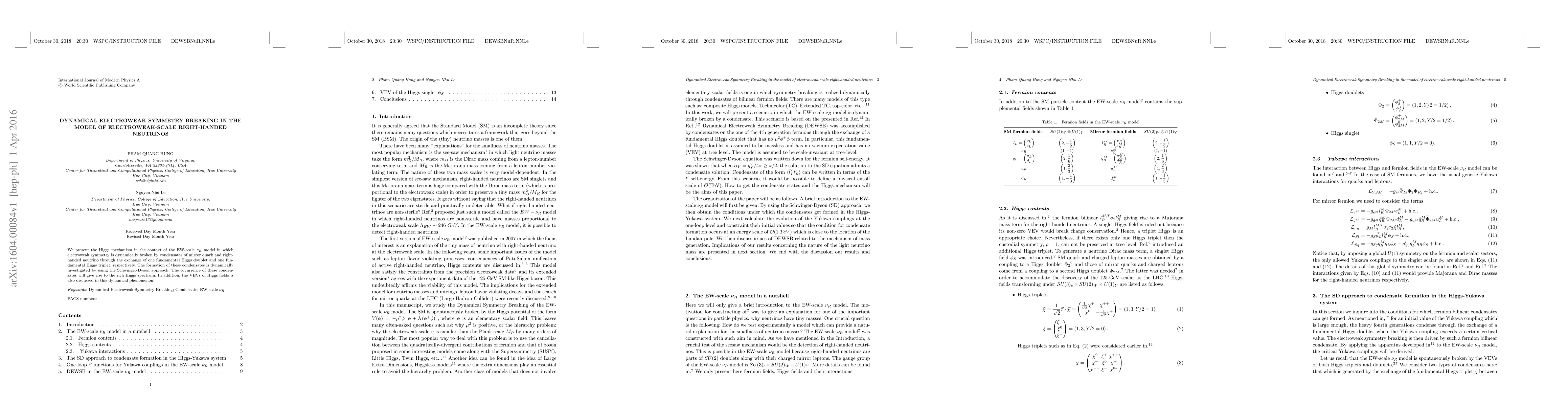 This paper explores the Higgs mechanism in a model featuring electroweak-scale right-handed neutrinos, where electroweak symmetry is dynamically broken by condensates of mirror quarks and right-handed neutrinos. The study employs the Schwinger-Dyson approach to investigate these condensates and their resulting rich Higgs spectrum.