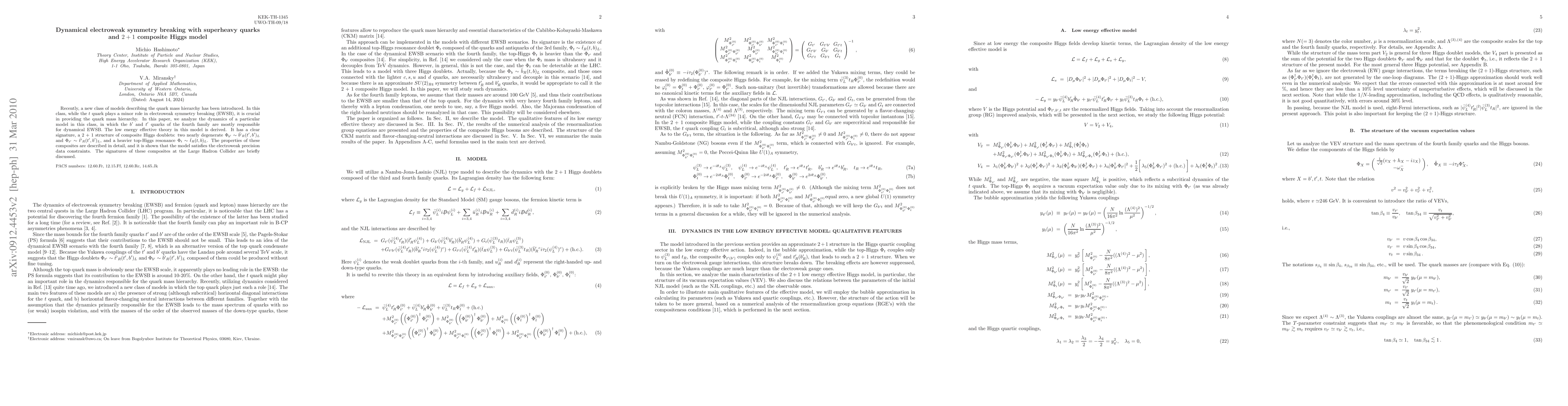 Recently, a new class of models describing the quark mass hierarchy has been introduced. In this class, while the t quark plays a minor role in electroweak symmetry breaking (EWSB), it is crucial in providing the quark mass hierarchy. In this paper, we analyze the dynamics of a particular model in this class, in which the b' and t' quarks of the fourth family are mostly responsible for dynamical EWSB. The low energy effective theory in this model is derived. It has a clear signature, a 2 + 1 structure of composite Higgs doublets: two nearly degenerate \Phi_{b'} and \Phi_{t'}, and a heavier top-Higgs resonance \Phi_t \sim \bar{t}_{R}(t,b)_L. The properties of these composites are described in detail, and it is shown that the model satisfies the electroweak precision data constraints. The signatures of these composites at the Large Hadron Collider are briefly discussed.