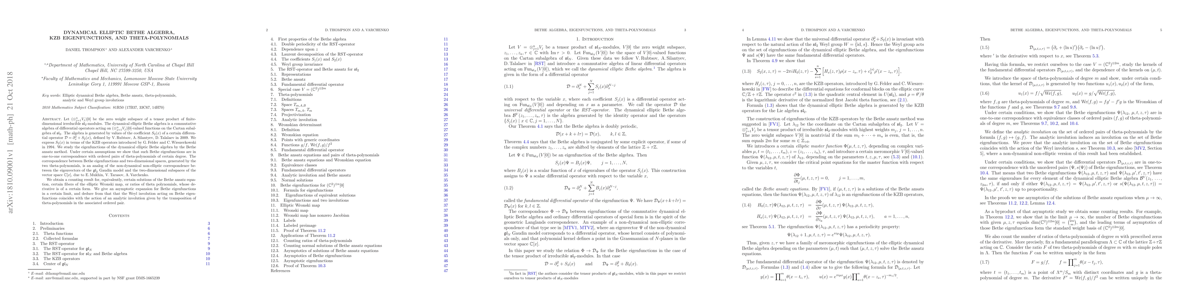 Let $(\otimes_{j=1}^nV_j)[0]$ be the zero weight subspace of a tensor product of finite-dimensional irreducible $\frak{sl}_2$-modules. The dynamical elliptic Bethe algebra is a commutative algebra of differential operators acting on $(\otimes_{j=1}^nV_j)[0]$-valued functions on the Cartan subalgebra of $\frak{sl}_2$. The algebra is generated by values of the coefficient $S_2(x)$ of a certain differential operator $D=(d/dx)^2+S_2(x)$, defined to V. Rubtsov, A. Silantyev, D. Talalaev in 2009. We express $S_2(x)$ in terms of the KZB operators introduced by G. Felder and C. Wieszerkowski in 1994. We study the eigenfunctions of the dynamical elliptic Bethe algebra by the Bethe ansatz method. Under certain assumptions we show that such Bethe eigenfunctions are in one-to-one correspondence with ordered pairs of theta-polynomials of certain degree. The correspondence between Bethe eigenfunctions and two-dimensional spaces, generated by the two theta-polynomials, is an analog of the non-dynamical non-elliptic correspondence between the eigenvectors of the $\frak{gl}_2$ Gaudin model and the two-dimensional subspaces of the vector space $\Bbb C[x]$, due to E. Mukhin, V. Tarasov, A. Varchenko. We obtain a counting result for, equivalently, certain solutions of the Bethe ansatz equation, certain fibers of the elliptic Wronski map, or ratios of theta polynomials, whose derivative is of a certain form. We give an asymptotic expansion for Bethe eigenfunctions in a certain limit, and deduce from that that the Weyl involution acting on Bethe eigenfunctions coincides with the action of an analytic involution given by the transposition of theta-polynomials in the associated ordered pair.