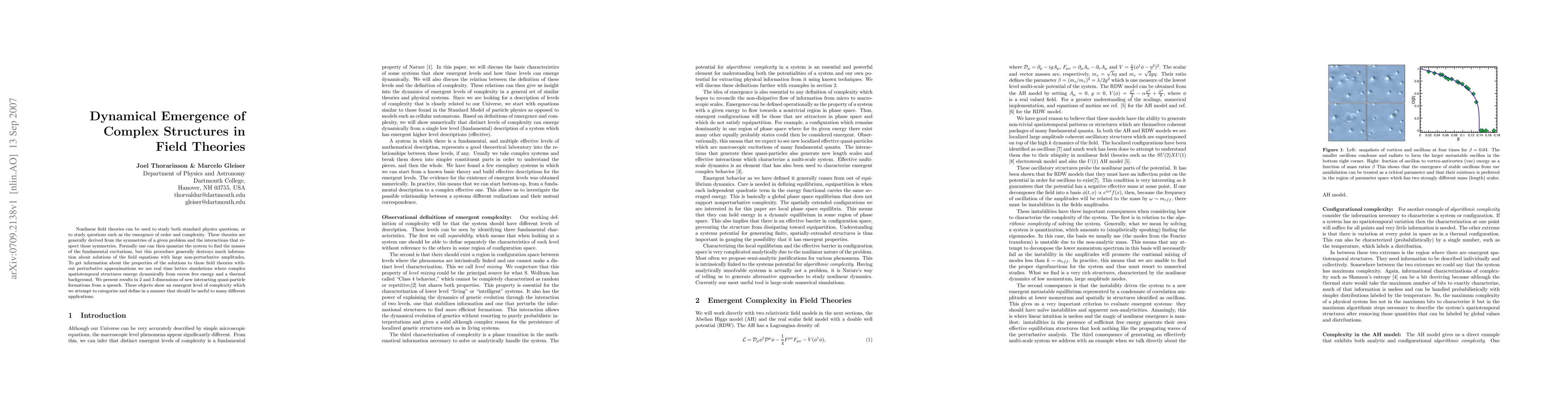 Nonlinear field theories can be used to study both standard physics questions, or to study questions such as the emergence of order and complexity. These theories are generally derived from the symmetries of a given problem and the interactions that respect those symmetries. Formally one can then quantize the system to find the masses of the fundamental excitations, but this procedure generally destroys much information about solutions of the field equations with large non-perturbative amplitudes. To get information about the properties of the solutions to these field theories without perturbative approximations we use real time lattice simulations where complex spatiotemporal structures emerge dynamically from excess free energy and a thermal background. We present results in 2 and 3 dimensions of new interacting quasi-particle formations from a quench. These objects show an emergent level of complexity which we attempt to categorize and define in a manner that should be useful to many different applications.