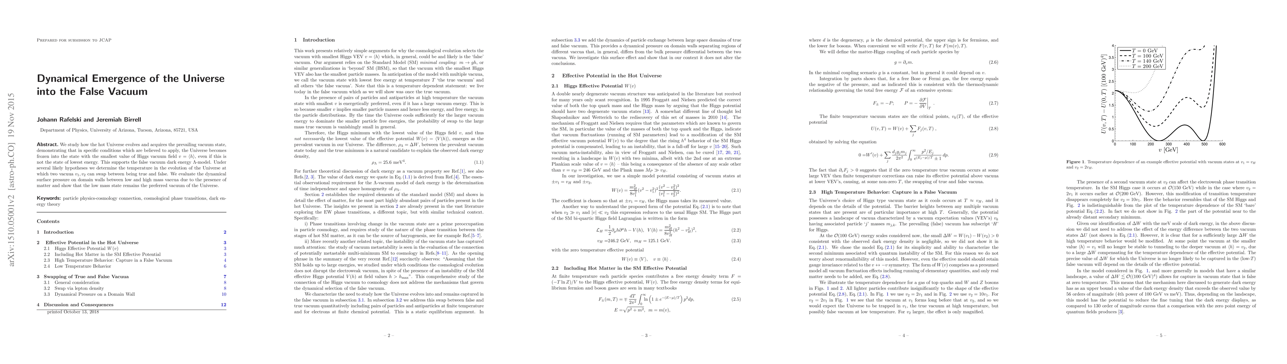 We study how the hot Universe evolves and acquires the prevailing vacuum state, demonstrating that in specific conditions which are believed to apply, the Universe becomes frozen into the state with the smallest value of Higgs vacuum field $v=\langle h\rangle$, even if this is not the state of lowest energy. This supports the false vacuum dark energy $\Lambda$-model. Under several likely hypotheses we determine the temperature in the evolution of the Universe at which two vacuua $v_1, v_2$ can swap between being true and false. We evaluate the dynamical surface pressure on domain walls between low and high mass vaccua due to the presence of matter and show that the low mass state remains the preferred vacuum of the Universe.