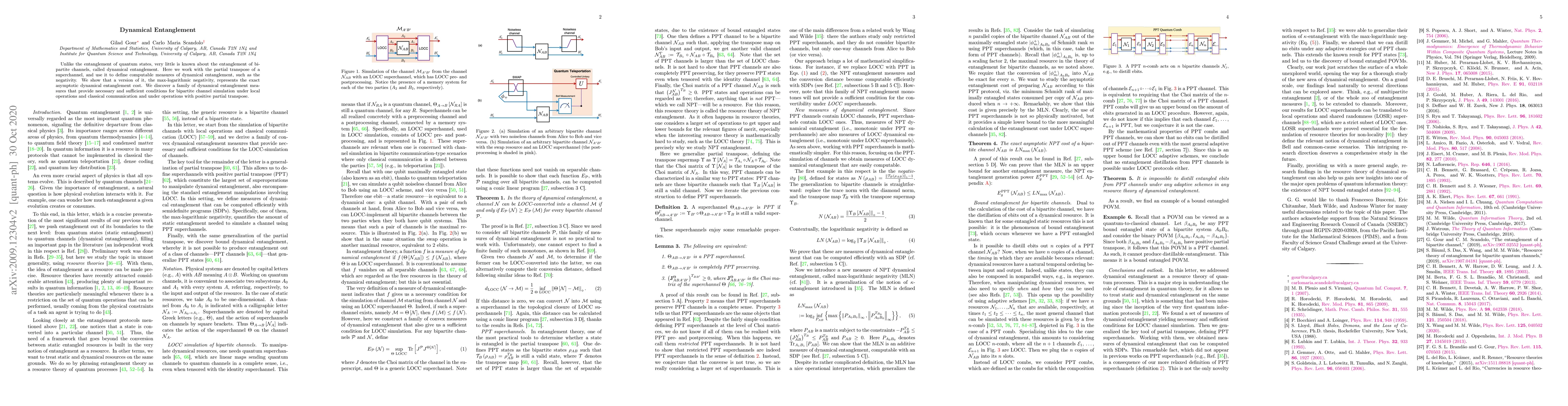 Unlike the entanglement of quantum states, very little is known about the entanglement of bipartite channels, called dynamical entanglement. Here we work with the partial transpose of a superchannel, and use it to define computable measures of dynamical entanglement, such as the negativity. We show that a version of it, the max-logarithmic negativity, represents the exact asymptotic dynamical entanglement cost. We discover a family of dynamical entanglement measures that provide necessary and sufficient conditions for bipartite channel simulation under local operations and classical communication and under operations with positive partial transpose.
