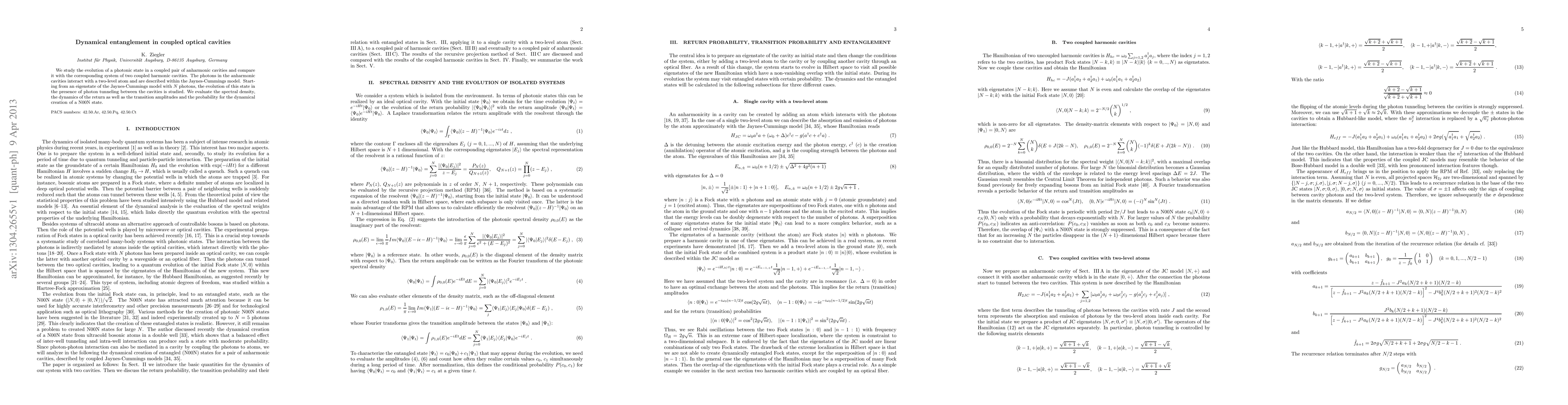 We study the evolution of a photonic state in a coupled pair of anharmonic cavities and compare it with the corresponding system of two coupled harmonic cavities. The photons in the anharmonic cavities interact with a two-level atom and are described within the Jaynes-Cummings model. Starting from an eigenstate of the Jaynes-Cummings model with N photons, the evolution of this state in the presence of photon tunneling between the cavities is studied. We evaluate the spectral density, the dynamics of the return as well as the transition amplitudes and the probability for the dynamical creation of a N00N state.