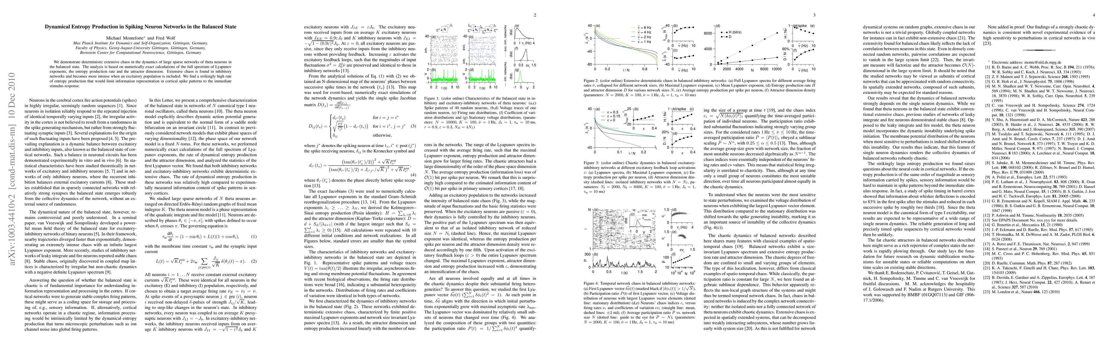 This paper investigates large, sparse networks of theta neurons in the balanced state, revealing extensive chaos through Lyapunov exponents and entropy production rate analysis. The study finds that inhibitory networks exhibit deterministic chaos, which intensifies with the addition of excitatory populations, leading to high entropy production that limits information representation in cortical spike patterns.