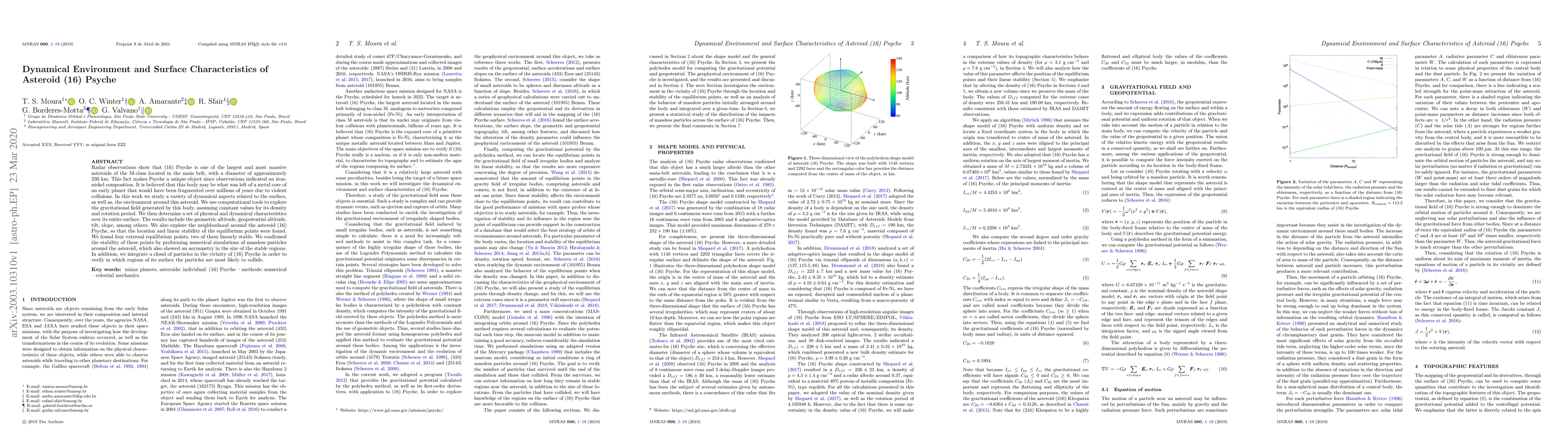 This paper investigates the dynamical environment and surface characteristics of the M-class asteroid (16) Psyche, revealing its iron-nickel composition and suggesting it may be a remnant metal core. The study uses computational tools to analyze its gravitational field, surface tilt, slope, and geopotential altitude, and identifies four external equilibrium points, two of which are linearly stable.