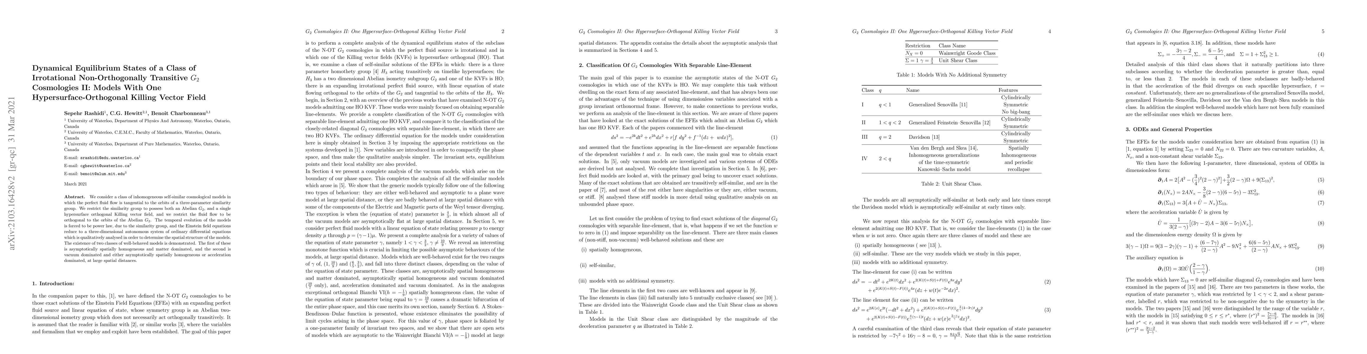 We consider a class of inhomogeneous self-similar cosmological models in which the perfect fluid flow is tangential to the orbits of a three-parameter similarity group. We restrict the similarity group to possess both an Abelian $G_{2}$, and a single hypersurface orthogonal Killing vector field, and we restrict the fluid flow to be orthogonal to the orbits of the Abelian $G_{2}$. The temporal evolution of the models is forced to be power law, due to the similarity group, and the Einstein field equations reduce to a three-dimensional autonomous system of ordinary differential equations which is qualitatively analysed in order to determine the spatial structure of the models. The existence of two classes of well-behaved models is demonstrated. The first of these is asymptotically spatially homogeneous and matter dominated, and the second is vacuum dominated and either asymptotically spatially homogeneous or acceleration dominated, at large spatial distances.