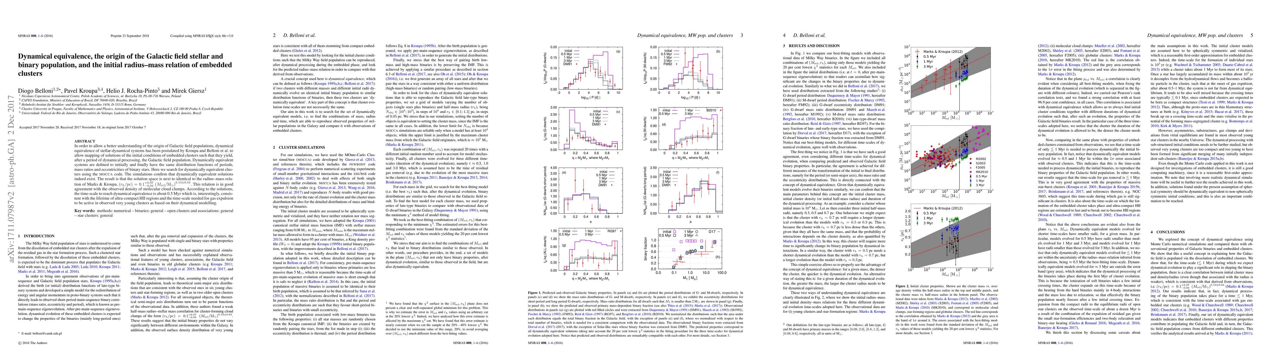In order to allow a better understanding of the origin of Galactic field populations, dynamical equivalence of stellar-dynamical systems has been postulated by Kroupa and Belloni et al. to allow mapping of solutions of the initial conditions of embedded clusters such that they yield, after a period of dynamical processing, the Galactic field population. Dynamically equivalent systems are defined to initially and finally have the same distribution functions of periods, mass ratios and eccentricities of binary stars. Here we search for dynamically equivalent clusters using the {\sc mocca} code. The simulations confirm that dynamically equivalent solutions indeed exist. The result is that the solution space is next to identical to the radius--mass relation of Marks \& Kroupa, $\left( r_h/{\rm pc} \right)= 0.1^{+0.07}_{-0.04}\, \left( M_{\rm ecl}/{\rm M}_\odot \right)^{0.13\pm0.04}$. This relation is in good agreement with the observed density of molecular cloud clumps. According to the solutions, the time-scale to reach dynamical equivalence is about 0.5~Myr which is, interestingly, consistent with the lifetime of ultra-compact HII regions and the time-scale needed for gas expulsion to be active in observed very young clusters as based on their dynamical modelling.