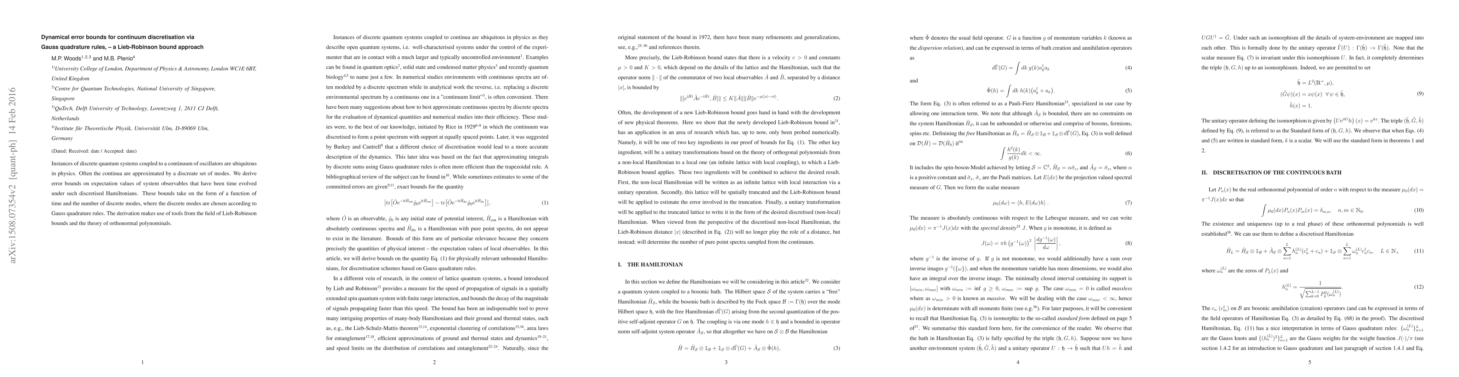 This paper derives analytical error bounds for discretised Hamiltonians approximating continua in quantum systems, using Gauss quadrature rules. The bounds are expressed as a function of time and the number of discrete modes, employing Lieb-Robinson bounds and orthonormal polynomial theory.