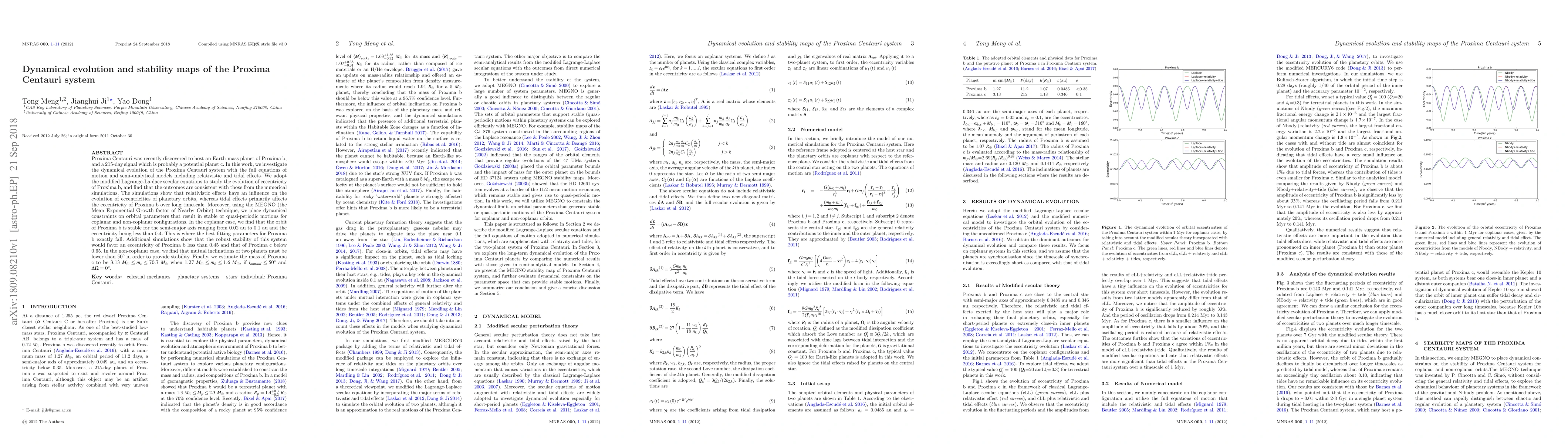 Proxima Centauri was recently discovered to host an Earth-mass planet of Proxima b, and a 215-day signal which is probably a potential planet c. In this work, we investigate the dynamical evolution of the Proxima Centauri system with the full equations of motion and semi-analytical models including relativistic and tidal effects. We adopt the modified Lagrange-Laplace secular equations to study the evolution of eccentricity of Proxima b, and find that the outcomes are consistent with those from the numerical simulations. The simulations show that relativistic effects have an influence on the evolution of eccentricities of planetary orbits, whereas tidal effects primarily affects the eccentricity of Proxima b over long timescale. Moreover, using the MEGNO (the Mean Exponential Growth factor of Nearby Orbits) technique, we place dynamical constraints on orbital parameters that result in stable or quasi-periodic motions for coplanar and non-coplanar configurations. In the coplanar case, we find that the orbit of Proxima b is stable for the semi-major axis ranging from 0.02 au to 0.1 au and the eccentricity being less than 0.4. This is where the best-fitting parameters for Proxima b exactly fall. Additional simulations show that the robust stability of this system would favor an eccentricity of Proxima b less than 0.45 and that of Proxima c below 0.65. In the non-coplanar case, we find that mutual inclinations of two planets must be lower than $50^{\circ}$ in order to provide stability. Finally, we estimate the mass of Proxima c to be $3.13~{M_ \oplus } \le {m_c} \le 70.7~{M_ \oplus }$ when $1.27~{M_ \oplus } \le {m_b} \le 1.6~{M_ \oplus }$, if ${i_{mutual}} \le {50^{\circ}}$ and $\Delta \Omega = 0^{\circ}$.